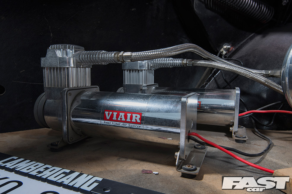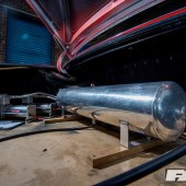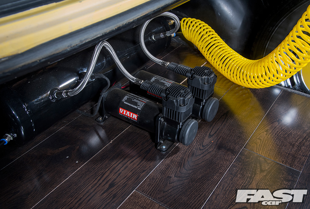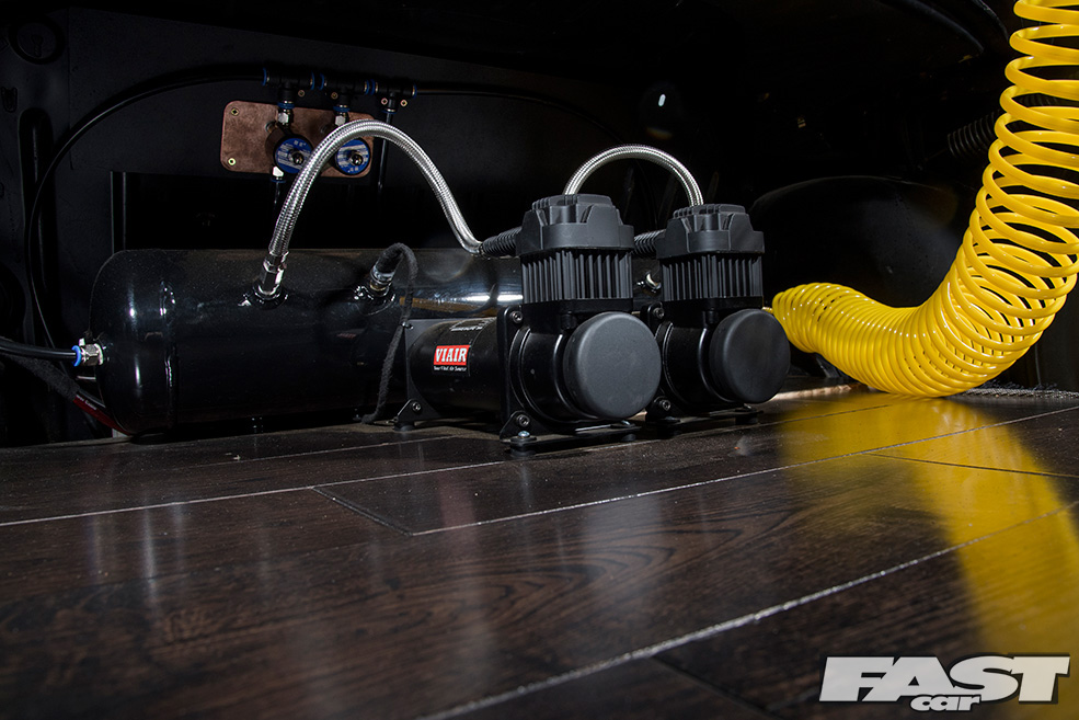 SSR Visconti wheels, custom home-built air-ride suspension setup using 6” Dominator bags, 2x 440 Black Edition compressors, manual control and 4-gallon Air Lift tank, disc brakes front and rear.
