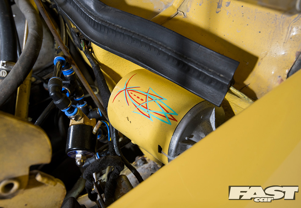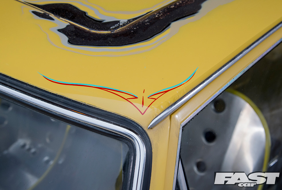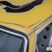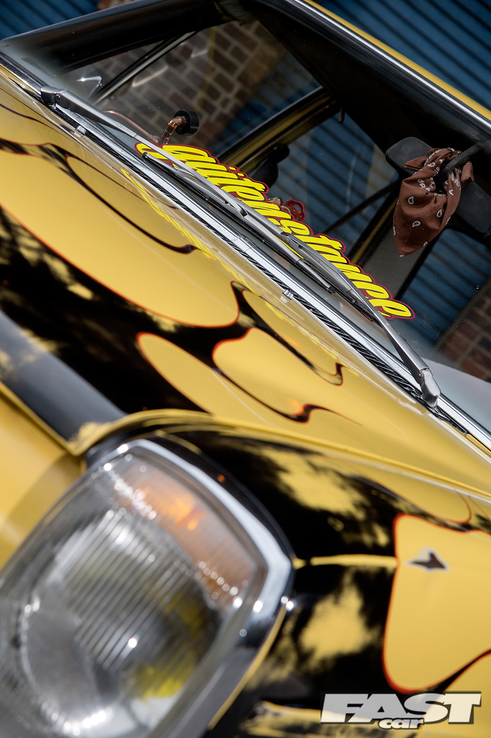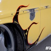Original yellow paint with lots of bare metal showing, pinstriped flames.