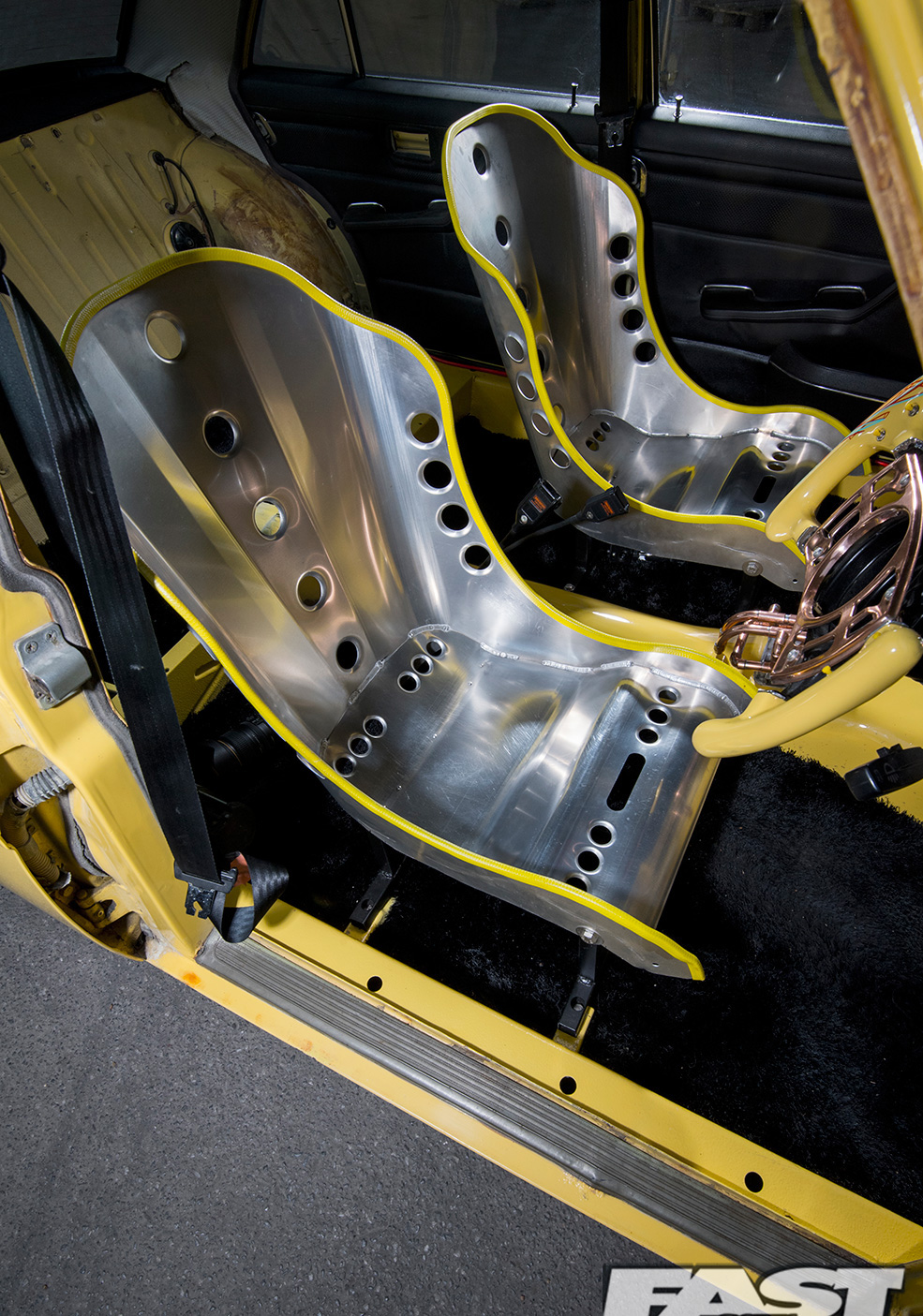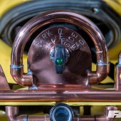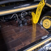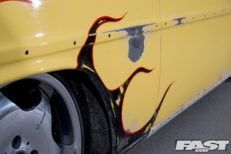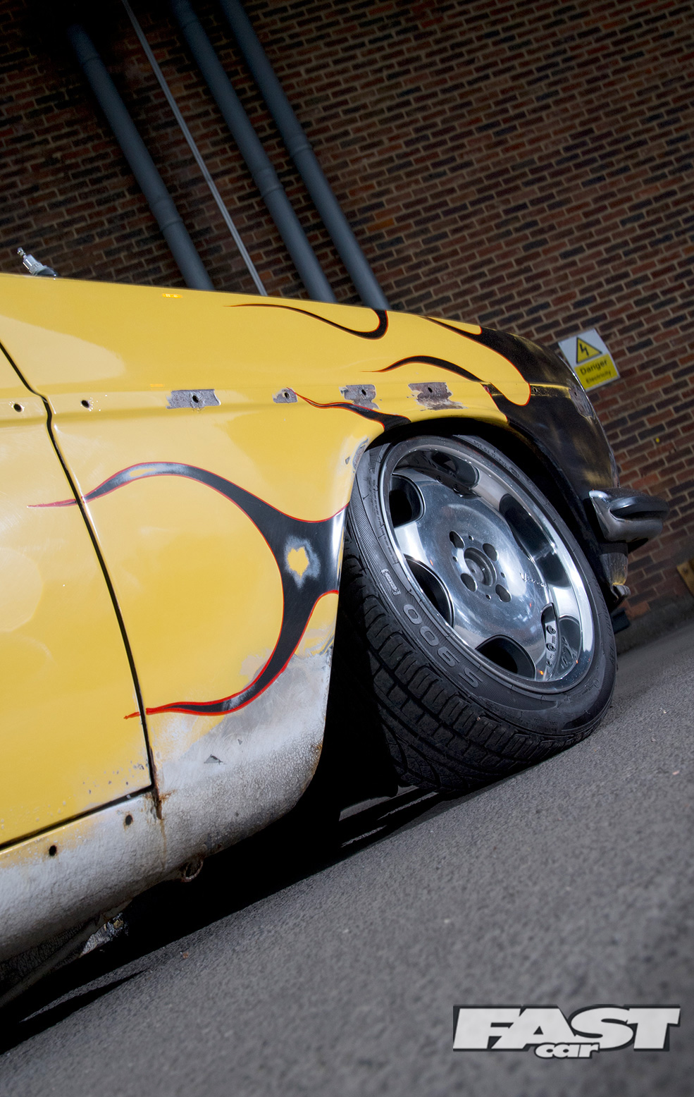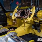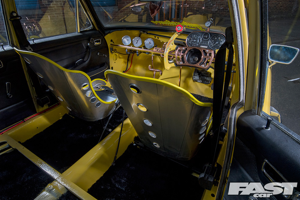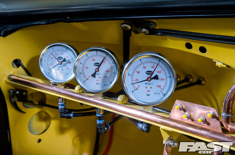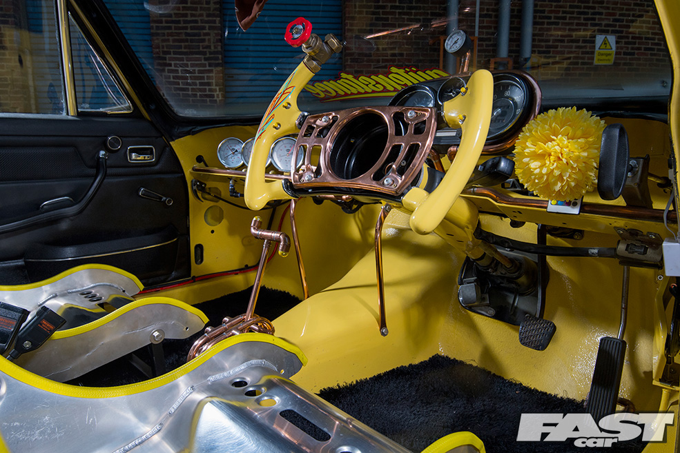 And how! After three months of solid graft on the driveway, the patinated yellow Merc now has a full custom interior, sporting a hand-crafted copper pipe dash, fully smoothed floors and tunnel, a bonkers cut-down steering wheel with the air-ride controls recessed into it and, as a last-minute addition that we reckon really finishes it off a treat, a pair of bomber-style metal seats.