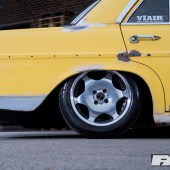 Stock wheels and hubcaps, custom home-built air-ride suspension setup using Firestone 5” double-bellow bags, 2x 444c Viair compressors, manual 2-way solenoid switch setup and 4-gallon Air Lift tank, disc brakes front and rear.
