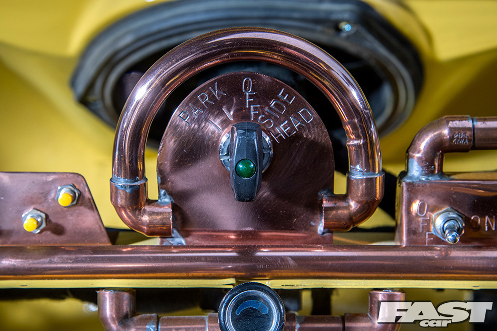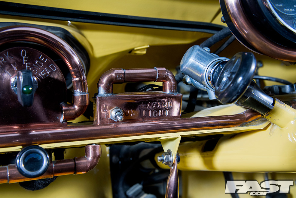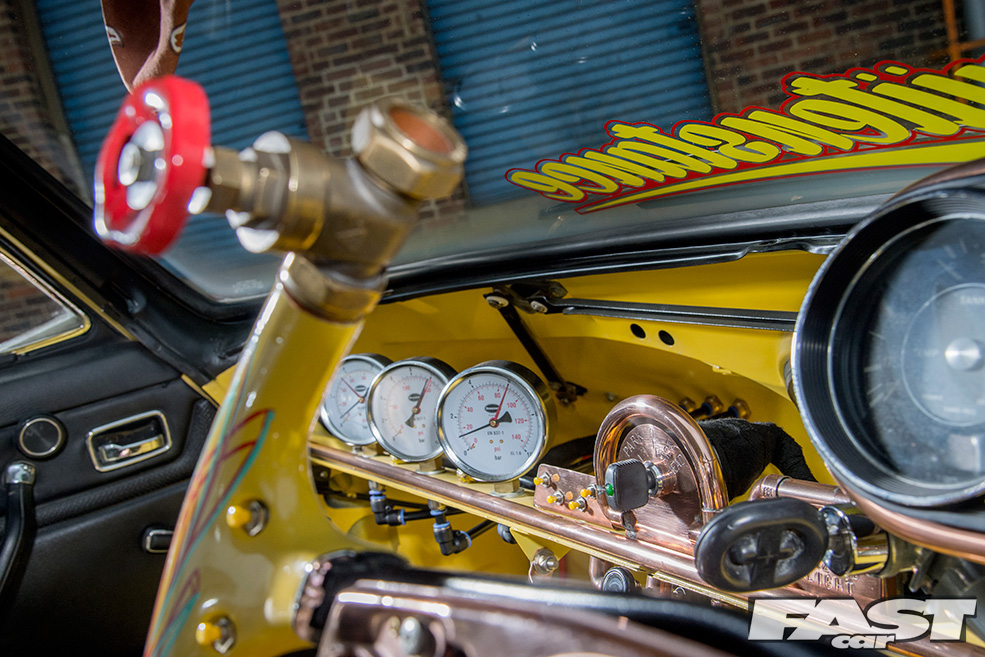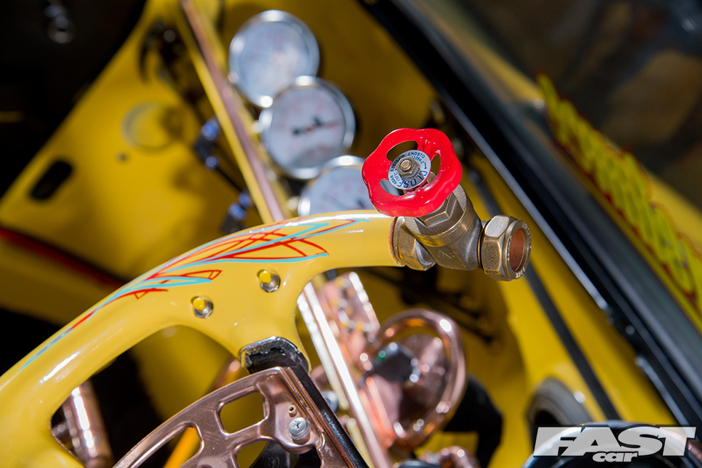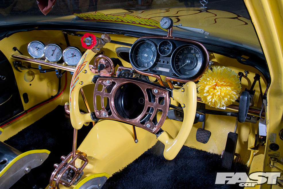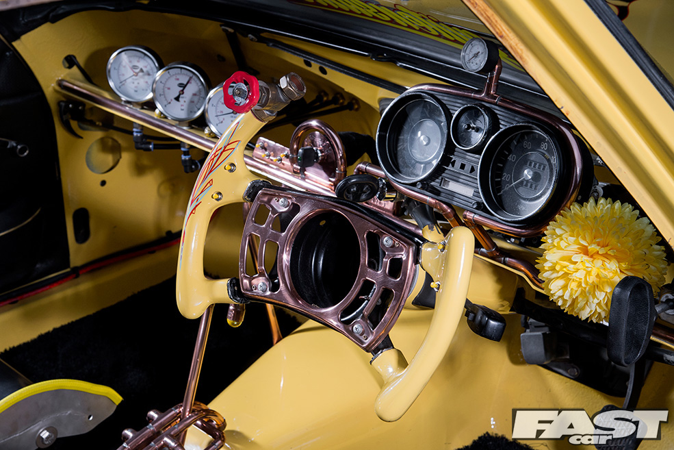 Full custom interior with smoothed floors and tunnel to bulkhead, copper pipe dash, cut-down colour-coded steering wheel with recessed air-ride controls, JaF Fabrication bomber-style metal seats.