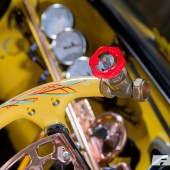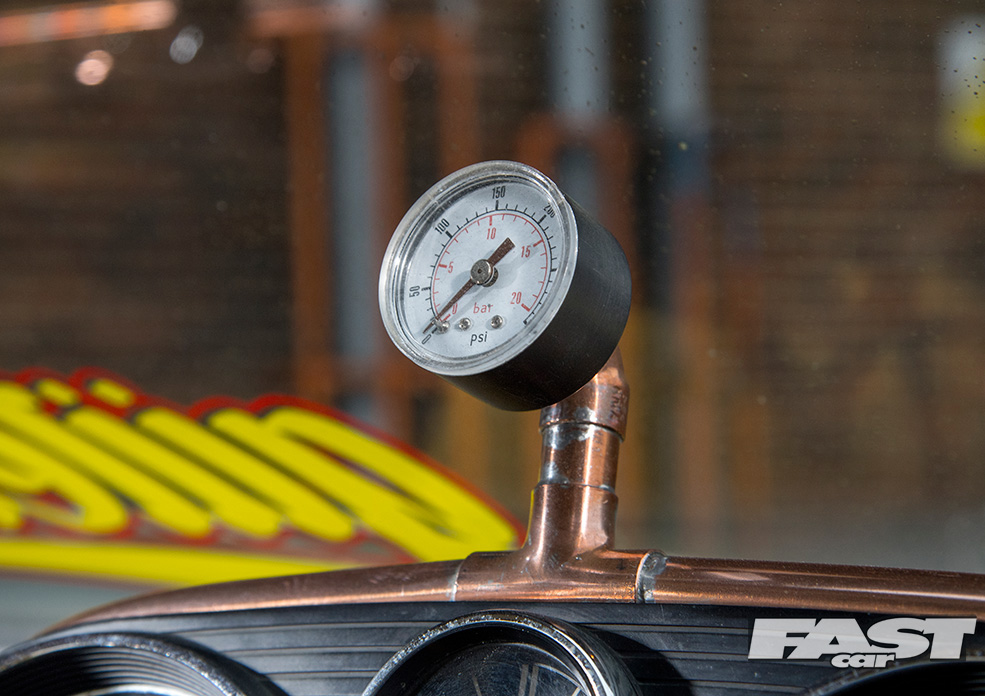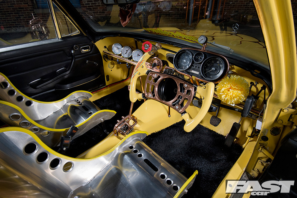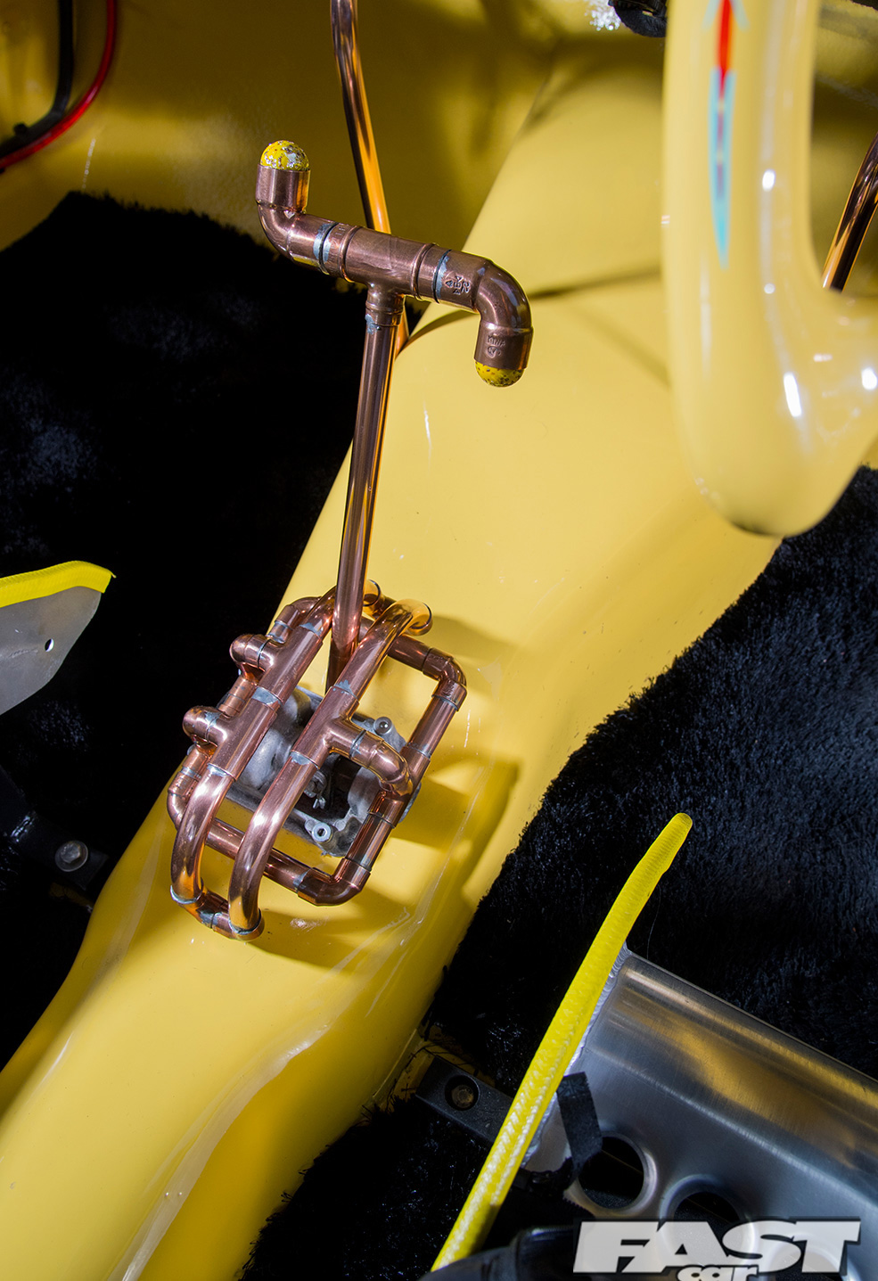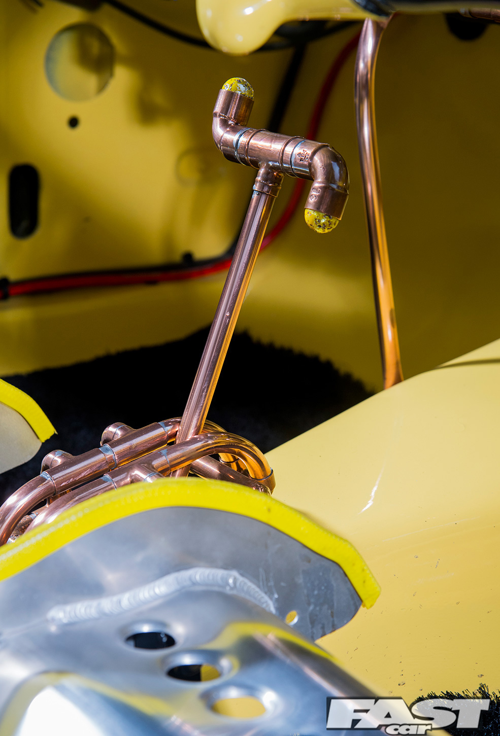 Full custom interior with smoothed floors and tunnel to bulkhead, copper pipe dash, cut-down colour-coded steering wheel with recessed air-ride controls, JaF Fabrication bomber-style metal seats.