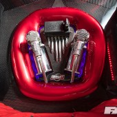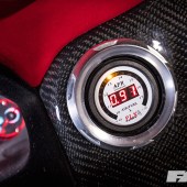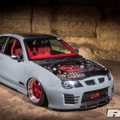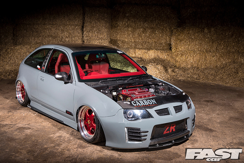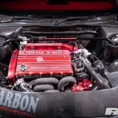 Rover T-Series 2.0-litre 16v turbo; forged oversized 86mm Arias pistons; steel H-beam conrods; big valve head, ported, stage 3 Kent cams, updated valve springs, solid lifters, and Vernier pulleys; DTA S60 standalone ECU; 660cc Siemens injectors; ARP main; head and conrod bolts; Garrett GT3076R ball-bearing turbo; custom tubular exhaust manifold with 38mm external wastegate and front side-exit screamer pipe; Kevlar clutch and lightened flywheel; K&N Group A Cosworth air filter; HKS SSQV blow-off valve, large R34 GT-R front-mount intercooler (painted black with stencilled ‘ZR’); custom alloy rocker cover, Magnecor race HT leads; subtle black Samco hoses; 2x 13in Kenlowe fans with standalone thermostat; converted to later wasted spark ignition; custom intercooler pipes (covered in carbon-fi bre); engine cleaned and painted; Candy Apple Red gearbox; custom carbon-fibre timing belt cover; full custom AMW Motorsport exhaust system – 2.5in turboback, custom carbon-fibre covered driveshafts; AFR gauge; SARD fuel pressure regulator and gauge; Gizmo electronic boost controller; Bee-R anti-lag/ rev-limiter kit; external Bosch fuel pump and inline filter; swirl pot and braided lines; fully smoothed bay with engine components relocated; wiring loom extended and re-routed inside car with fusebox/ ECU behind dash; power steering under driver wing; ABS removed; brake lines hidden under car; engine bay fully laminated in real carbon-fibre; custom 1/5 carbon-fi bre bonnet to show off bay, custom carbon fibre strut top caps; scuttle panel under windscreen; carbon-fibre panels in bay to hide some components; PG1 gearbox with limited-slip diff and Dark Ice Designs short-shifter.
