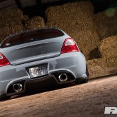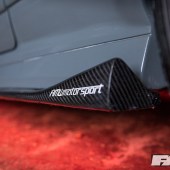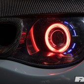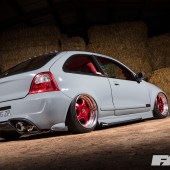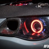 Ferrari Grigio Medio respray (inc. underbody); carbon fibre skinned roof; custom carbon fibre rear vortex spoiler; full one-off metal wide arch body, extended 3in each side, built around the wheels; bigger inner arches to allow rolling on full drop; side repeaters smoothed off; custom front bumper, standard indicators and fogs smoothed off; new subtle LEDs custom-made inside grilles; bumper widened to meet new arches; larger mouth for more air into intercooler; custom R8-style grilles; DRLs installed perpendicular to grilles; bumper extended 2in lower with custom carbon-fibre splitter; de-badged, custom rear bumper – widened and side shape changed to meet arches; square numberplate recess; carbonfi bre diffuser (Jaguar F-Type style); carbon-fibre side trims made to match custom skirts – extended 2in lower, built around custom carbon-fibre lower section flared out 3in to meet new arches with race-inspired aero fi n; carbon-fibre detailing on door pillars; screamer pipe trim; fuel filler neck and inner wheel liners; carbon-f bre wing mirrors with indicators built in; various LED illuminated areas on exterior inc. under-car LEDs; illuminated intercooler and LEDs inside diffuser; modified Mk2 ZR headlights with retrofitted bi-Xenon projector lenses and dual angel-eyes; custom carbon-fibre headlight duct in passenger headlight; customised AutoArt rear lights; carbon-fibre skinned wiper arms; tailgate de-wipered with custom carbon-fi bre bung.