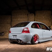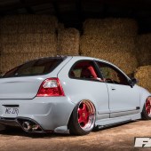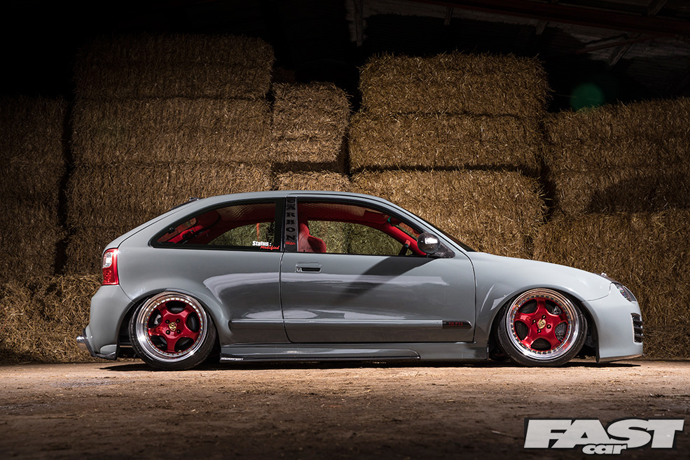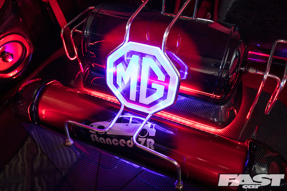 9x17in (front) and 10x17in (rear) RH ZW1 two-piece wheels with Candy Red centres and stencil work, wider lips, gold bolts and custom Porsche centre caps; 25mm (front) and 15mm (rear) spacers; 215/40 Yokohama Parada Spec II tyres; custom air-ride system, Air Lift V2 management; 2x Viair compressors, 1x 4-gallon tank and 1x 5-gallon tank; custom etched MG logo inside dummy hard lines with built-in LED illumination; polished 6-pot Tarox callipers with 355mm 2-piece discs; custom engineered camber shims on rear; custom front top mounts; rear axle/disc brake conversion; fully polybushed; uprated Dark Ice Designs rear anti-roll bar; OMP strut brace.
