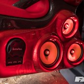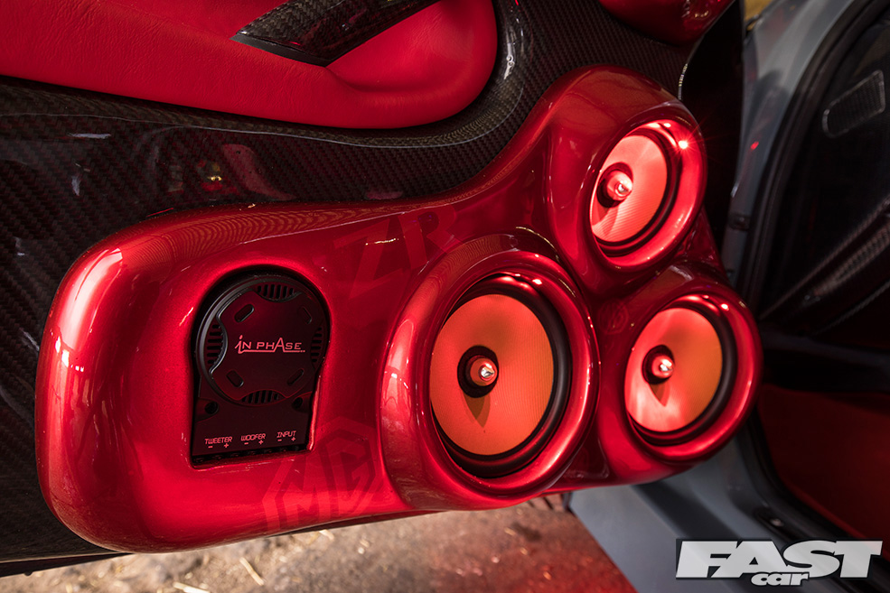 iPad as headunit; Kicker 12in square sub in custom carbon-fibre enclosure; Kicker KX1200.1 monoblock amp with bass switch on dash; 3x pairs In Phase component speakers in front door cards (2x 6.5in, 1x 5.25in) in custom Candy Red speaker pods; 5x7in In Phase coaxial speakers in custom pods in rear door cards; 5.25in In Phase component speakers in tailgate install; 2x Kenwood amps hidden under false carbon-fibre floor; car runs Google Chromecast wifi (or HDMI converter in non-wifi areas).
