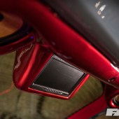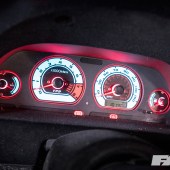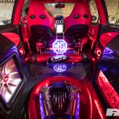 Custom carbon-fibre dash with iPad centre console and extra 7in TV in dash centre; top section added in flocked red to reduce glare; Sparco half suede/ half leather steering wheel and snap-off boss kit; custom carbon-fibre door cards – reworked in new shape with DIY speaker pods painted Candy Red with stencils; custom tailgate build with component speakers; 7in TV displaying rear view camera for shows; Recaro Trendline seats (from Honda Accord) re-trimmed in red leather with custom carbon fibre back panels and custom Recaro stencil work; stripped rear with carbon-fibre everywhere; custom carbon-fibre boot build inc. carbon-fibre floor (with MG pattern in weave); square sub enclosure; opposite amp rack/hidden battery box; air-ride install; tank mounts and caps; custom carbon-fibre switch panels in glovebox; custom A,B,C pillars flocked red with triple gauge pod smoothed into driver A pillar; diamond-stitched leather headlining; red Rover BRM carpet with custom red mats; flocked black centre console with modified switch arrangement; heater controls relocated behind iPad; Plasma dials; various LED illuminated areas inc. air-ride install.