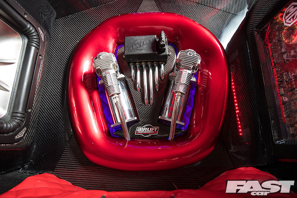 He did a bit of research to see how it was all constructed, then he made his own struts, plumbed in the air-ride himself, and the job was a good ’un. And then he covered everything in custom home-made carbon-fibre. Obviously.