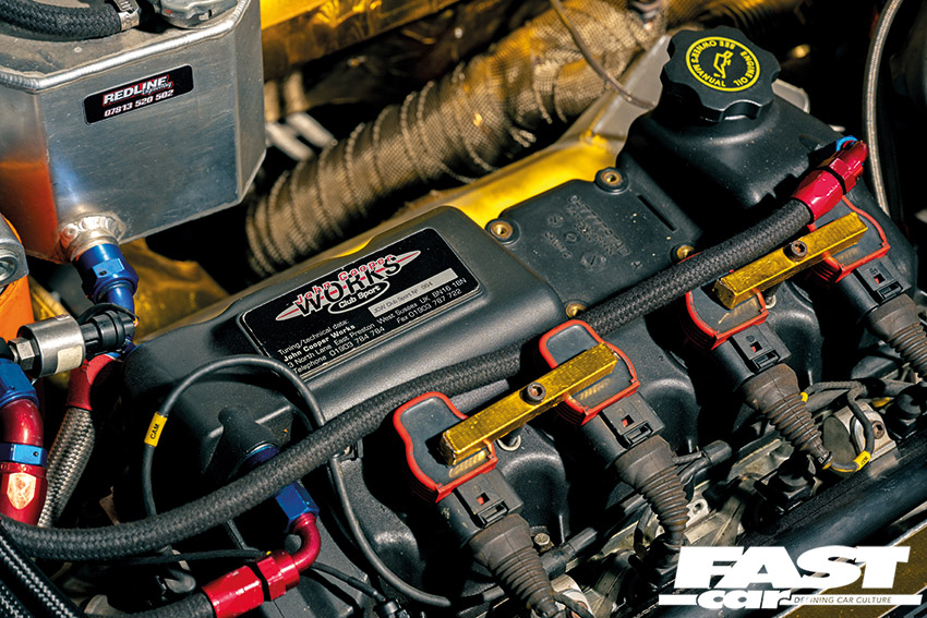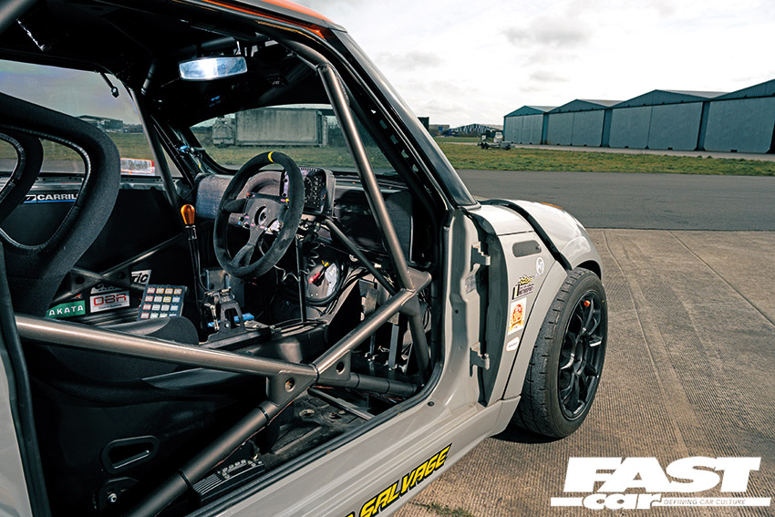 The engine itself was built by Brett Sims Motorsport and has a delicious race specification. It includes Carrillo rods and pistons, has a fully flowed and ported head with double springs and oversized valves, titanium valve-spring tops and collets, a Brett Sims race cam, a Revolution Motor Works inlet manifold, ASNU 1050cc injectors, Audi RS coil packs, a bespoke WOSP alternator and a lightweight clutch and flywheel.