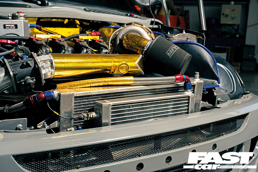 After talking to specialists, who weren’t keen to sell him the parts to make the turbo conversion, Nigel thought he’d do it himself. “I spoke to Dave King at JEK, who built the manifold, and I thought, you know what, he seemed to know what he was doing, so I went with him. He did all the manifold, the intercooler, the radiator and the oil cooler. We took the aluminium crash bar off the front, and it’s been replaced by a bespoke front end for it, so if I punt someone in a race, it won’t damage the radiator,” he explains.