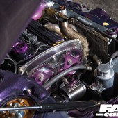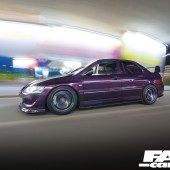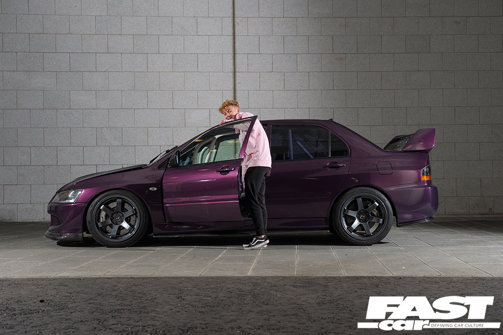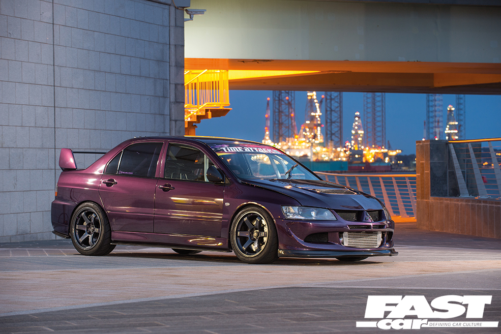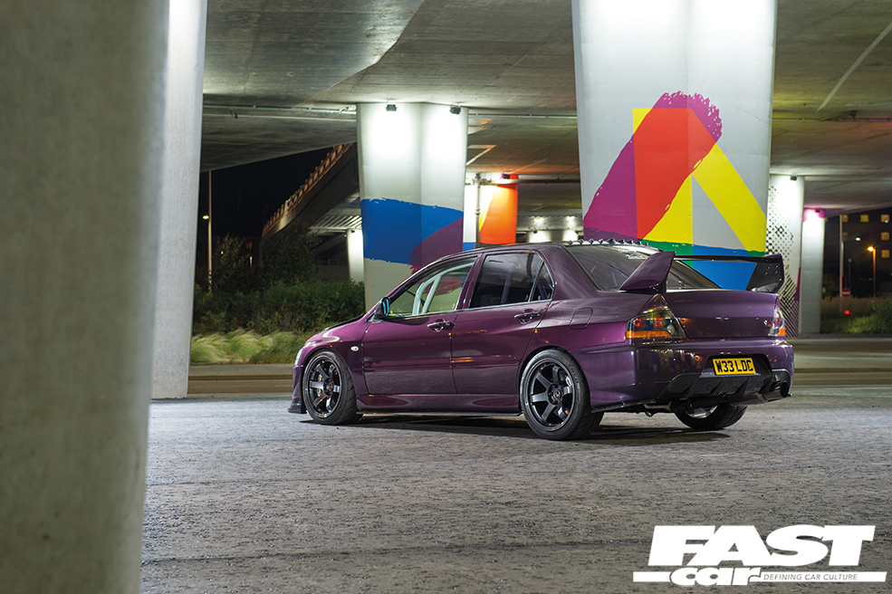 There’s nothing tense here, just glittery purple and good times. Lawrence Connor’s modified Mitsubishi Evo 8 is packing some highly entertaining horsepower figures, and this thing’s been built to last…