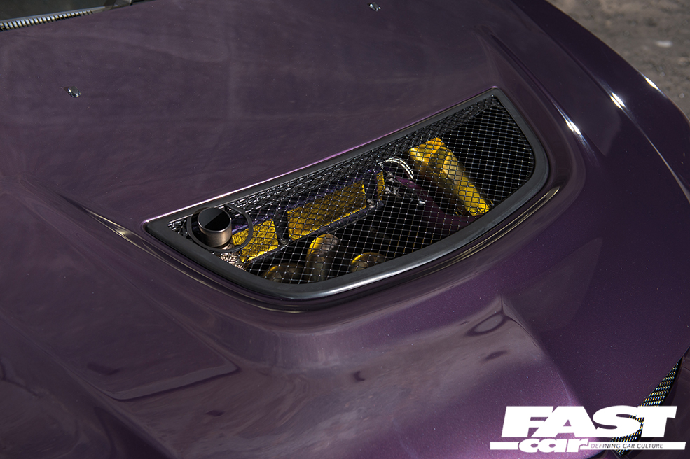 House of Kolor S2-KBC10 Purple Kandy paint, carbon fibre spoiler, carbon vortex generators, carbon splitter, carbon FQ400 mirrors, carbon rear spats, carbon sideskirt extensions, carbon front badge, anodised purple bonnet raisers, modified bonnet grille for screamer pipe.
