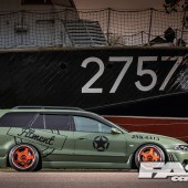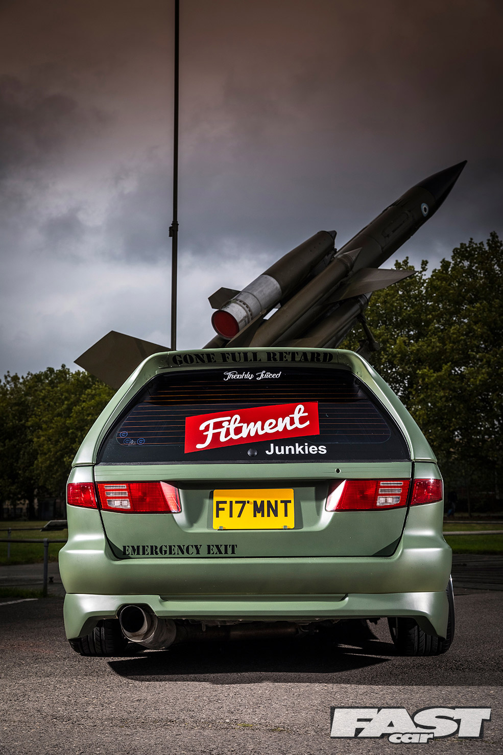 Yep, this is proper outside-the-box stuff, and you’ve got to admire the dude’s ingenuity. This continues to the colour scheme, too. He was having trouble matching the limited edition paint shade, so what did he do? Sacked it off entirely and slathered the whole slab-sided wagon in Nato Green. Sod it, why not eh? And from there, naturally, the full-on military theme was but a stepping stone away. It would have been churlish not to.