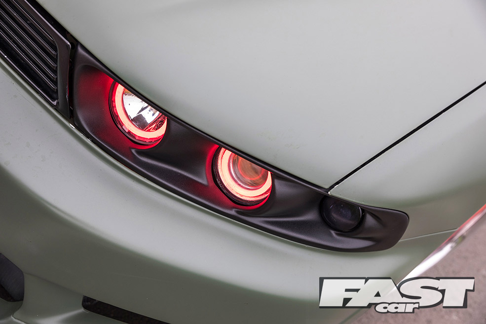 Custom Evo VII front bumper; aftermarket front grille; Cibie headlights with custom demon eye halos; side-hinged bonnet; Super VR4 skirts; Ganador