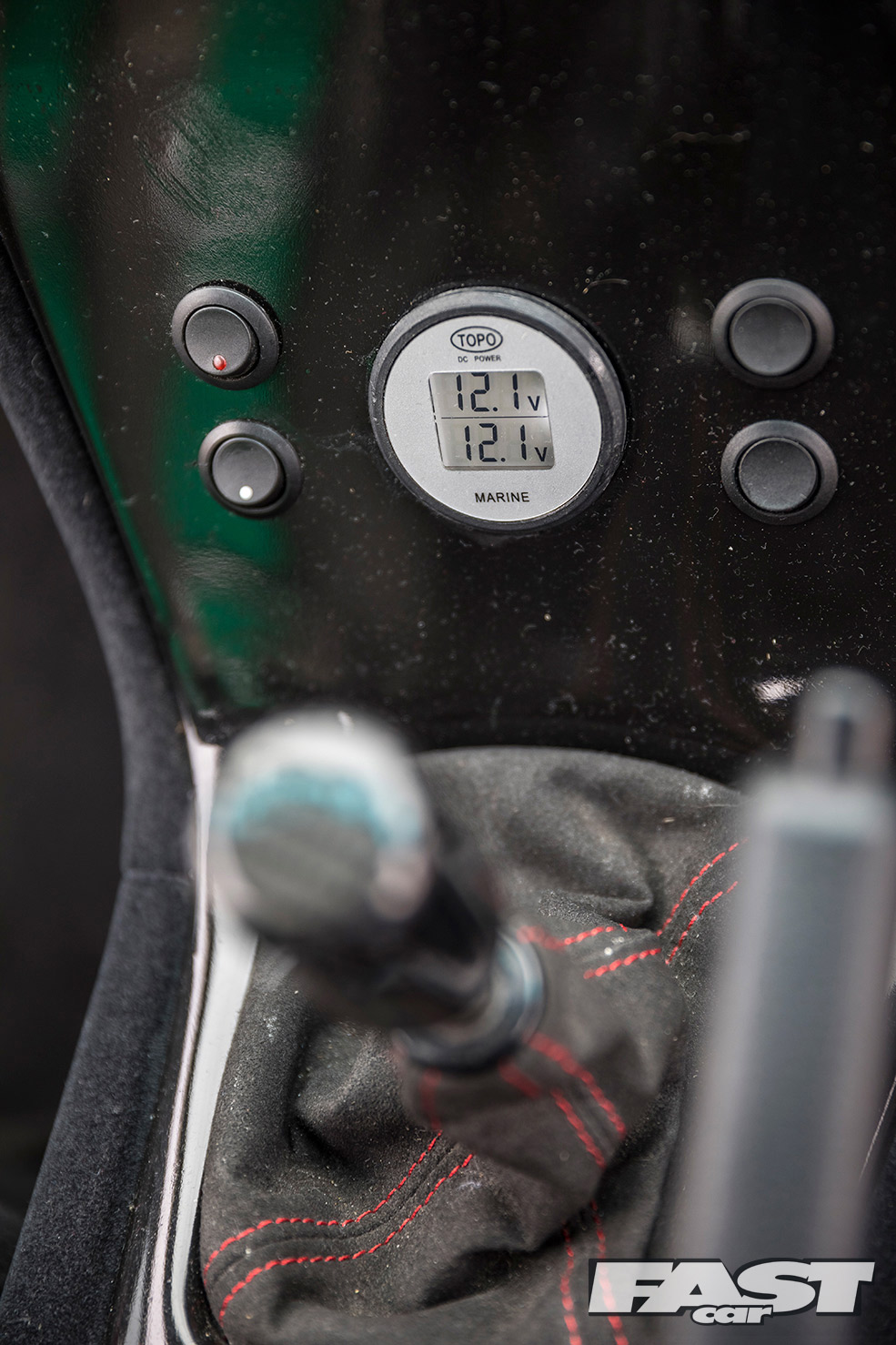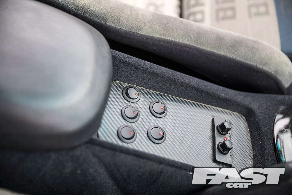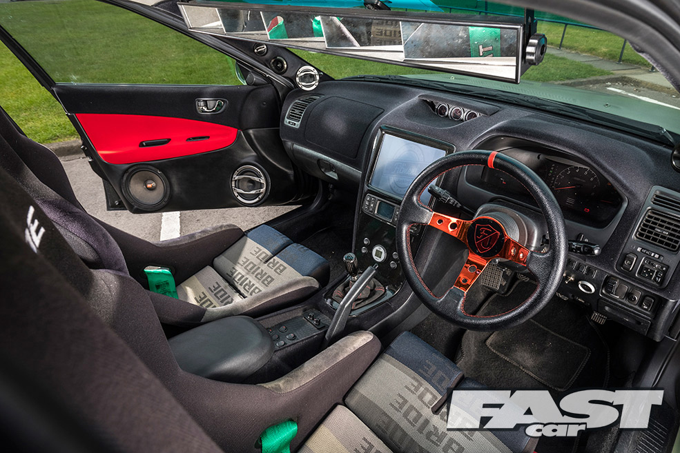 With his enthusiasm and confidence bolstered, Darren then set about stuffing the back with gizmos, all surrounding a custom rear bench from a 200SX which, he gleefully admits, was installed with the help of a hammer, an angle-grinder and an electric bread knife. And look, there’s even amps sunken into the rear footwells!