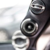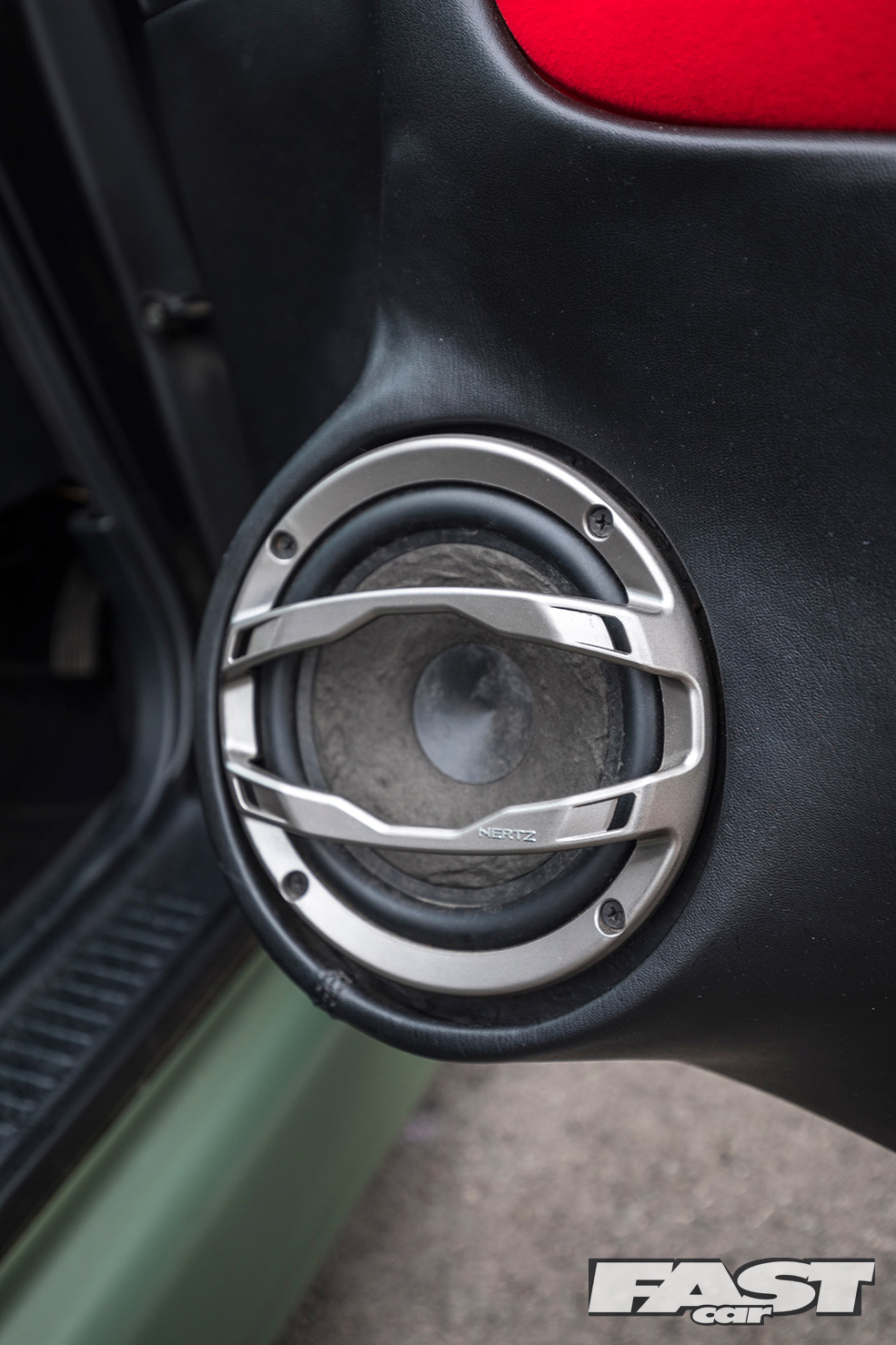 ST25 tweeters and HSK163 three-ways in A-pillars; HSK163 mid speakers and 8in SPL show subs in front doors; 2x 12in Rockford Fosgate T2D212 1200w subwoofers; 5x Rockford Fosgate power amps running all audio – controlled by Rockford 360.3 EQ; 3x amps and EQ built into boot; 2 amps built into rear footwells; LED headlining; dash, pillars, door tops and boot trims all flocked black.