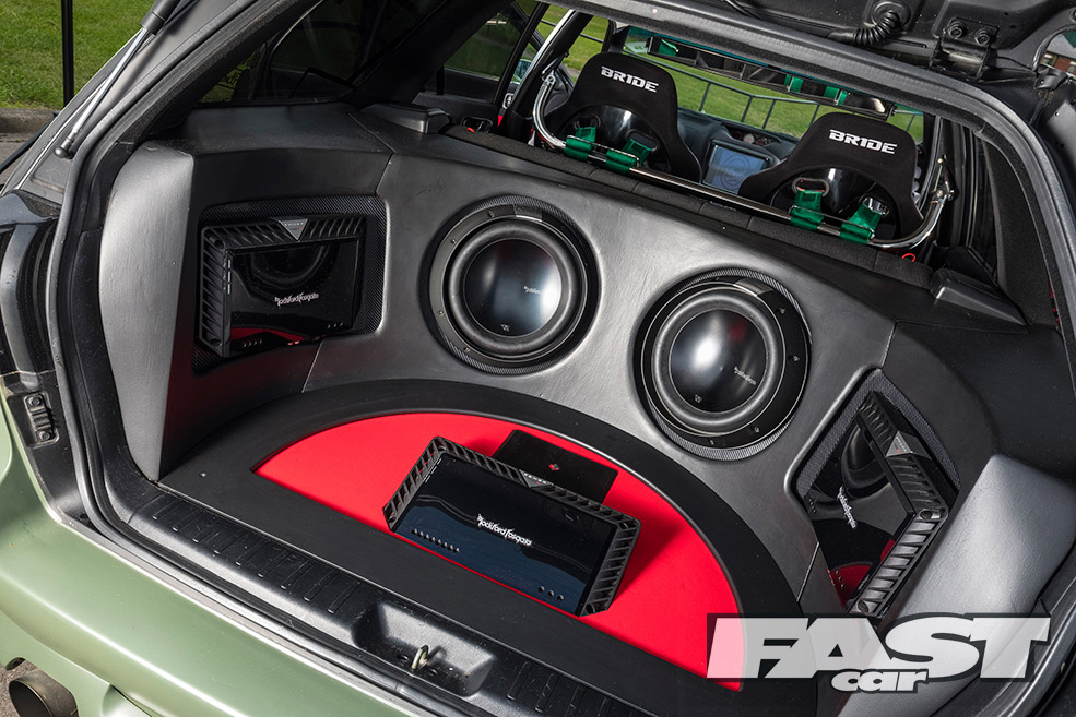 It helps that Darren’s a carpenter by trade, as he was able to fabricate all of the housings himself in ply and MDF. “I started out with two 12s and some uprated mids,” he continues, “which was fine, but hardly attention-seeking. So I installed two batteries into the boot and fitted a second alternator in place of the aircon pump. With my power supply sorted I went to town on the front of the car. The front seats were swapped for Bride buckets and Takata harnesses, which made room in each door for an 8-inch Hertz SPL and a 6.5-inch mid. This was my first attempt at playing with fibreglass and it didn’t go badly!”