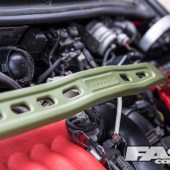 9.5x18in (front) and 10x18in (rear) SSR Koenig rims; 215/40 (f) and 225/40 (r) Nankangs; Evo Brembo brake conversion front and rear; Tein street coilovers; full Energy Suspension polybush kit of 48 bushes; custom upper rear arms with adjustable camber mounts; reverse-mounted camber correction kit fitted to front.