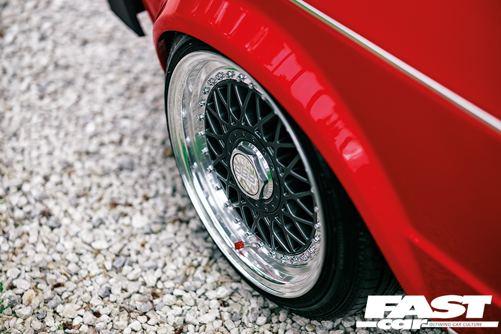 Airlift air ride with 3P digital management, 15″ BBS RM split rim’s with polished centres, stretched 165/50/15 Bridgestone Potenzas, G60 drilled and grooved discs 280mm, Mk3 callipers, bias brake pedal box, chassis notched, track rod flip kit, ball joint raise kit