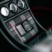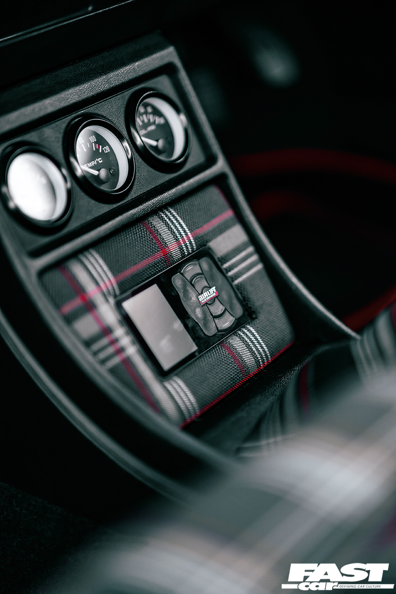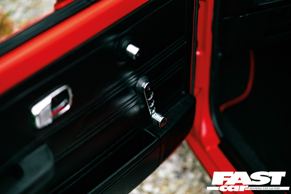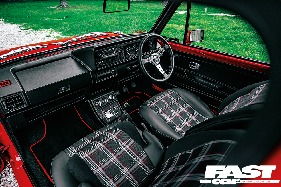 Inside the car is just as thoughtfully executed and features fully re-trimmed seats in leather and Mk7 Golf GTI tartan cloth with headrest delete and matching booster seat by Joe Elding. The Mk7 tartan theme continues with the custom centre console that neatly houses the Airlift 3P controls and with the matching gear lever gaiter. The chrome touches on the exterior of the car are complemented by those inside including door handles, window winders and mirror adjustment knobs. Triple VDO gauges provide an iconic way to monitor those all-important Ts and Ps whilst a hidden audio install with Ground Zero subwoofers under the seats brings the bass. A leather classic Nardi is a well-chosen, inkeeping tiller. And a bespoke boot build with custom painted air tank brings up the rear.