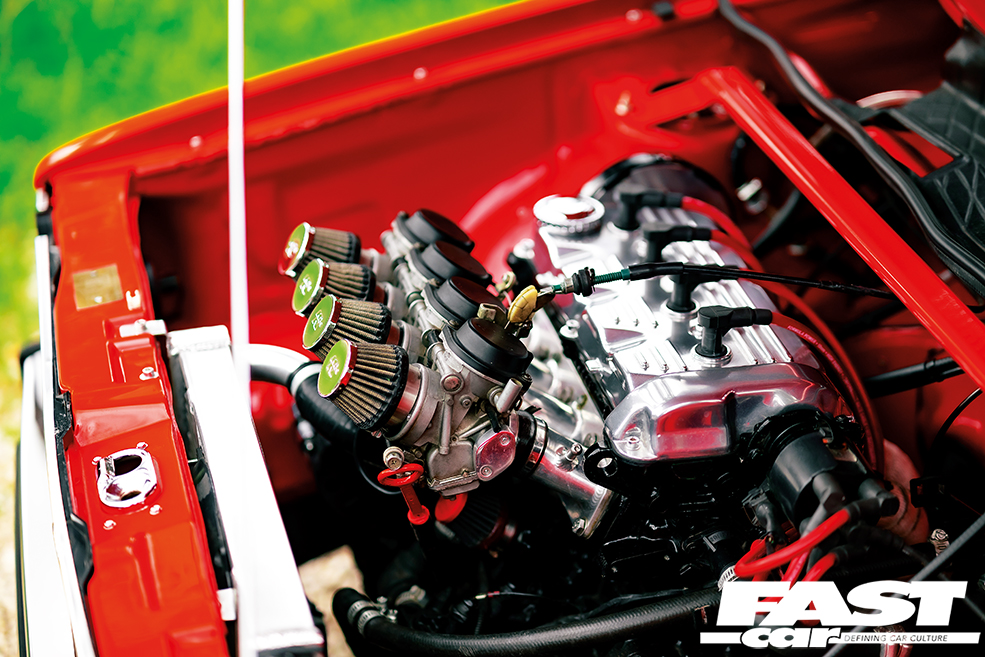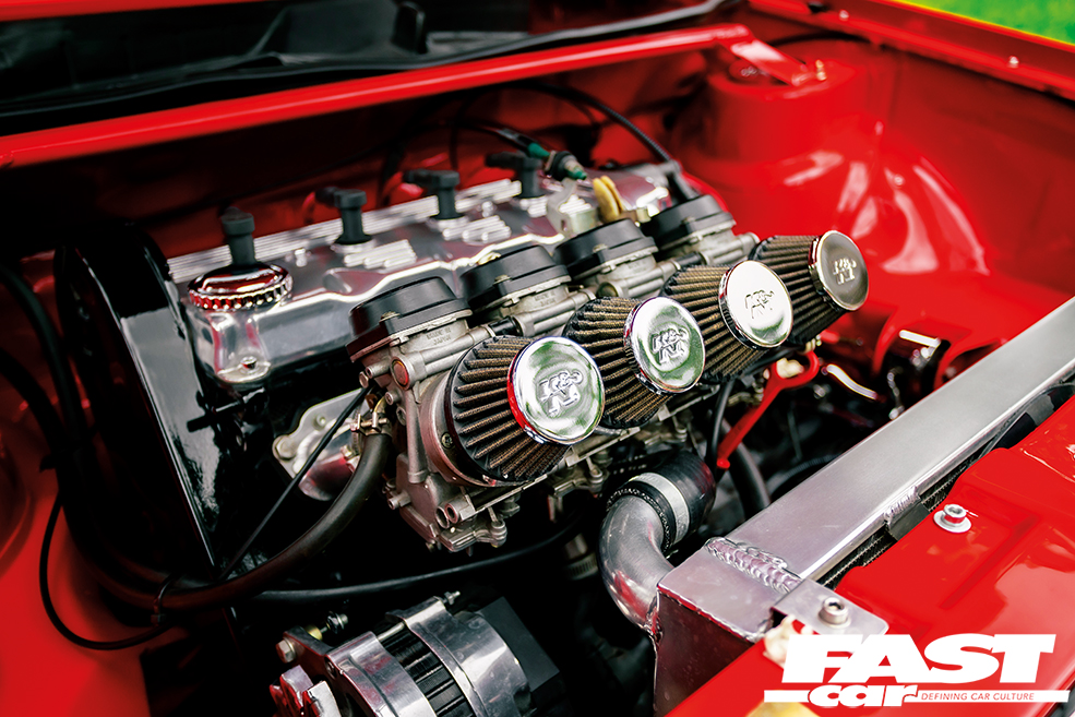Two-litre ABF with Yamaha R1 Bike Carbs with K&N filters, Borg Brothers custom manifold Smoothed engine bay with wire tuck, battery and washer bottle relocated to the boot, hidden ignition coil and brake reservoir, custom 2″ stainless steel exhaust system, custom radiator, transmission: O20 gearbox
