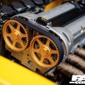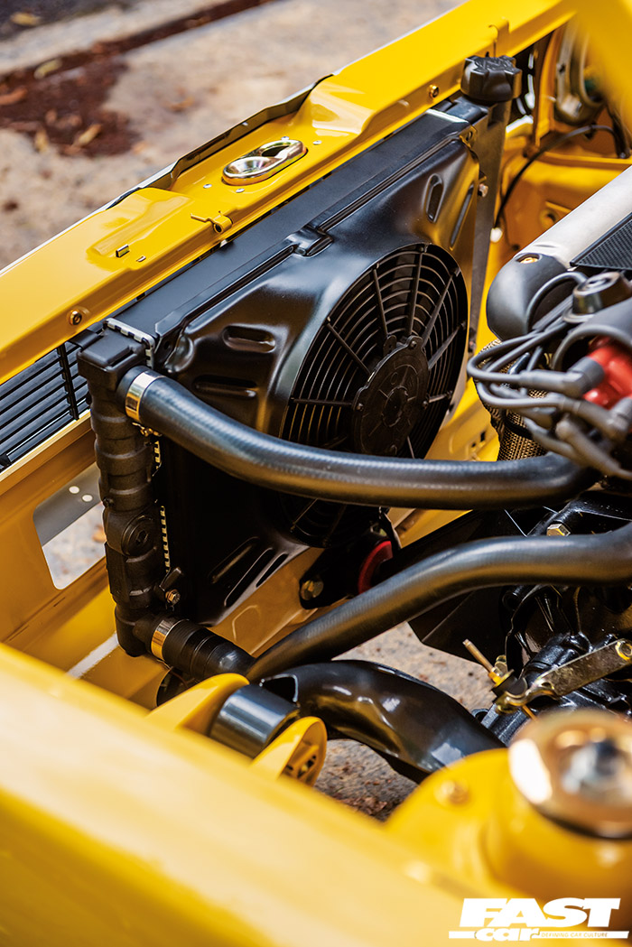 The modified Mk1 Golf already had a Facet Posiflo fuel pump, Sytec fuel pressure regulator and a Mk2 distributor and ignition module from when the 1.4 engine was originally installed by the previous owner, but Mick added a new Jetex 50mm exhaust system, complete with a Titanium heat wrapped 4-2-1 exhaust manifold, a set of gold plated pulleys and engine bolts, a Porsche oil filler cap, an S1 top-fill radiator with slimline fan and Anti-Gravity lightweight battery.