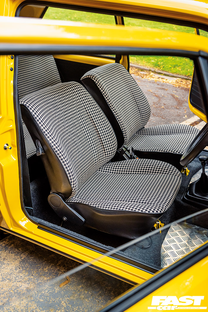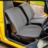 350mm black Momo Heritage Prototipo steering wheel with gold plated bolts, N spec black and white check low-back seats, series 1 GTI centre console, TIM Superdash LED electronic tachometer and water temperature gauges, battery mounted behind centre console, original four-speed gearknob, original roof lining, carpets, doors cards and parcel shelf, ToricT-76 automatic seat belts (rare)