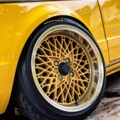 8x15in ET25 Axis OG san gold alloy wheels with 165/50/15 Nankang Ultra Sport NS2 tyres, 25mm rear spacers, H&R ultra-low coilovers, Porsche 924 modified strut mount and gold-plated top cap, Noath Precision 50mm ball joint extenders and rose jointed track rod flip kit, seam welded lower arms, standard GTI front anti-roll bar, ST Suspension ST rear anti-roll bar, full suspension and steering polyurethane bush kit, GTI calipers and vented and MTEC grooved discs (front), standard drum brakes (rear), Series 1 1.1 non-servo master cylinder