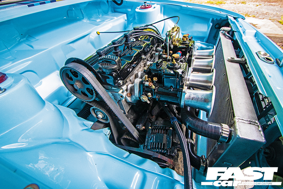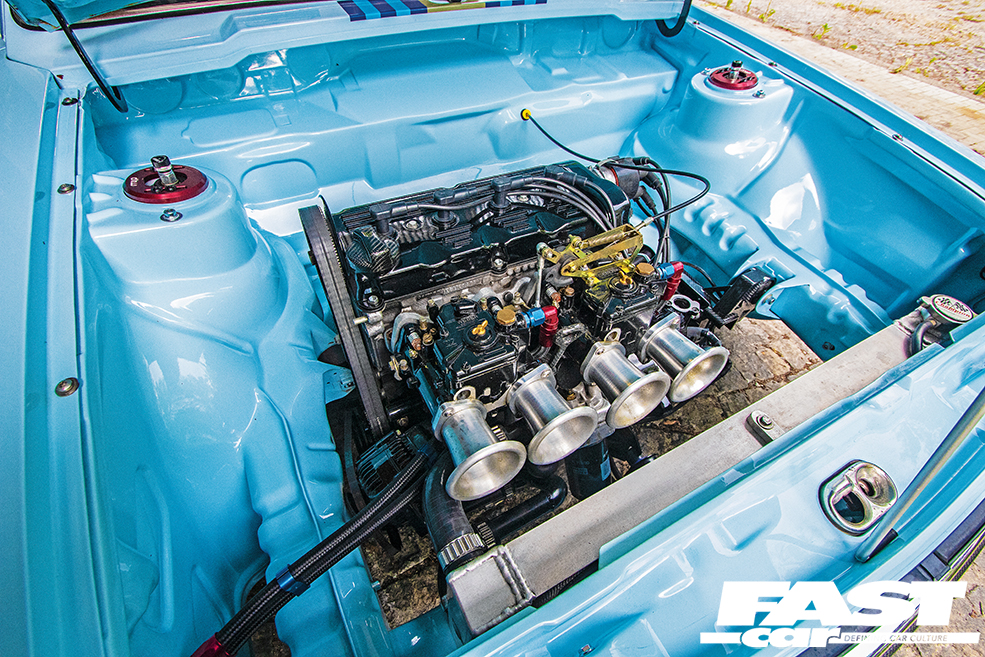 2.0-litre 16v (from Corrado G60), twin Weber carbs with 45mm throttle bodies, ported head, DBilas cams, 4-2-1 Supersprint exhaust system, shaved bay, carbon engine mounts, carbon oil cap, Corrado G60 gearbox, Sachs clutch