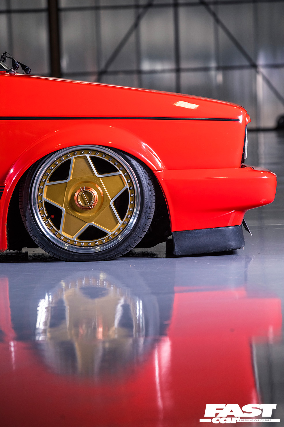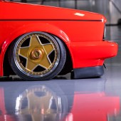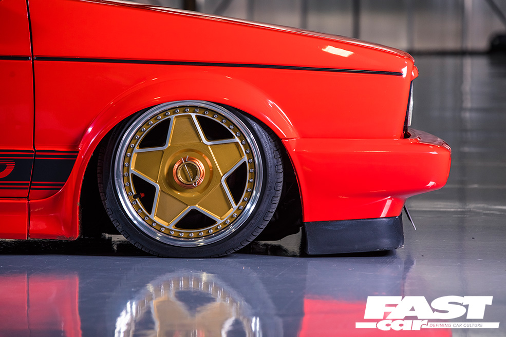 7×16” (front) and 8×16” (rear) Autostrada Modena 3-piece wheels, Toyo tyres, bespoke HavAir struts and top-mounts, Firestone bags, 2x Viair 444c Black compressors, 2x 3-gallon tanks, Air Lift 3H management, GTI brake system with Mk2 16v servo and Mk1 239mm vented/drilled front discs.