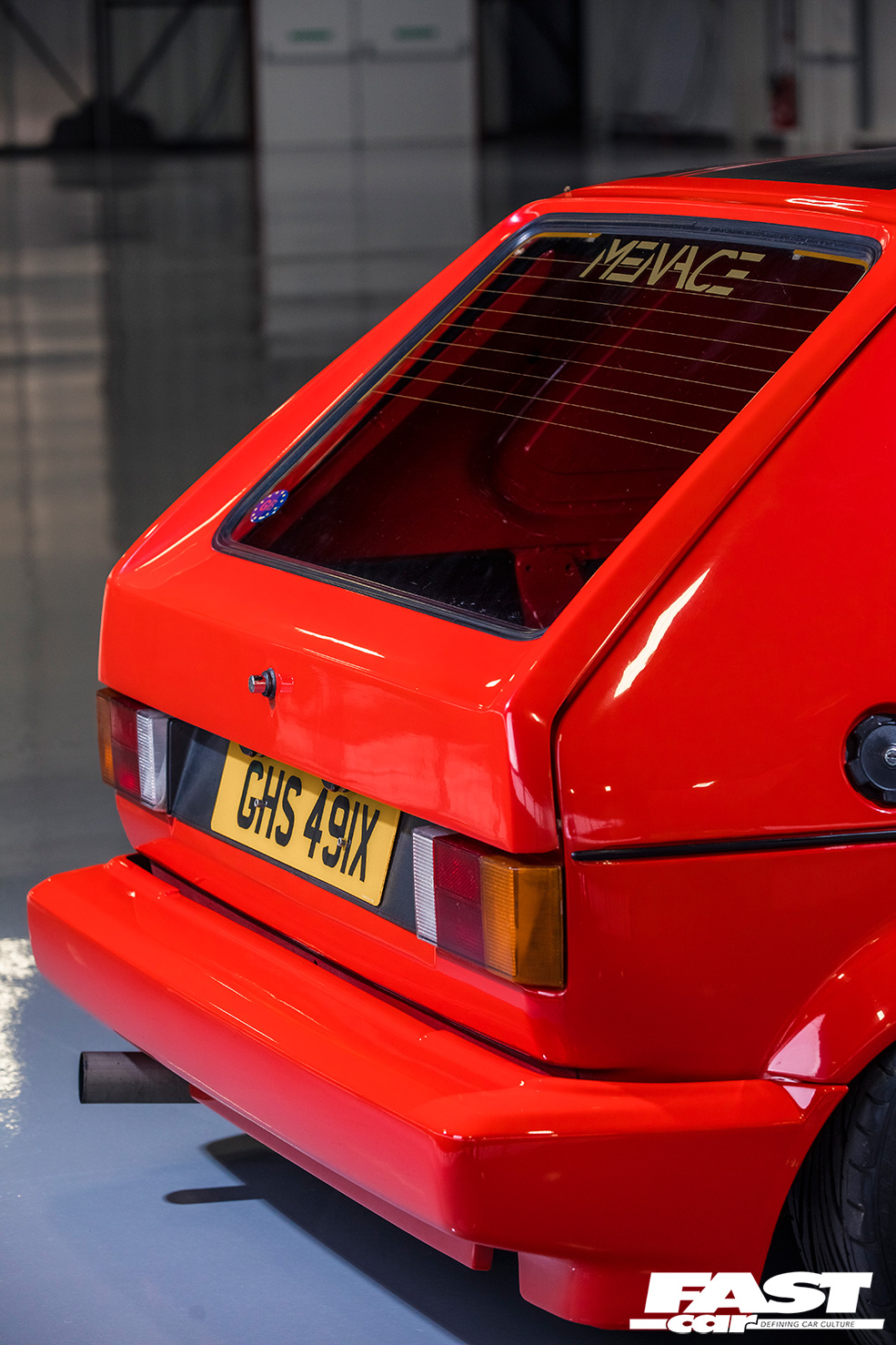 Original fire-service Golf van, Mars Red, Clipper Cabriolet bodykit, de-badged and de-wipered tailgate, early Mk1 taillights.
