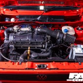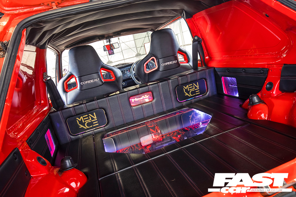 And let’s not forget the real work this Golf has to do. As a promotional tool for an air-ride specialist, it’s got to have a pretty impressive bag setup, doesn’t it? And peering underneath doesn’t disappoint, as your gaze is met by bespoke HavAir struts, running Firestone bags and Air Lift 3H management. Lifting the tailgate reveals a glorious install too, showcasing the twin Viair compressors and three-gallon air tanks – along with the part that really ties the build back in to Fast Car’s 1987 roots: the audio. See, stereo installs used to be such a big deal on show cars, and while that’s still the case for some, you’re far less likely these days to find an ostentatious neon-lit boot build crafted from acres of fibreglass.