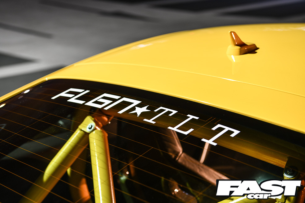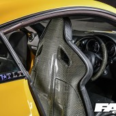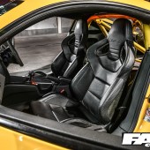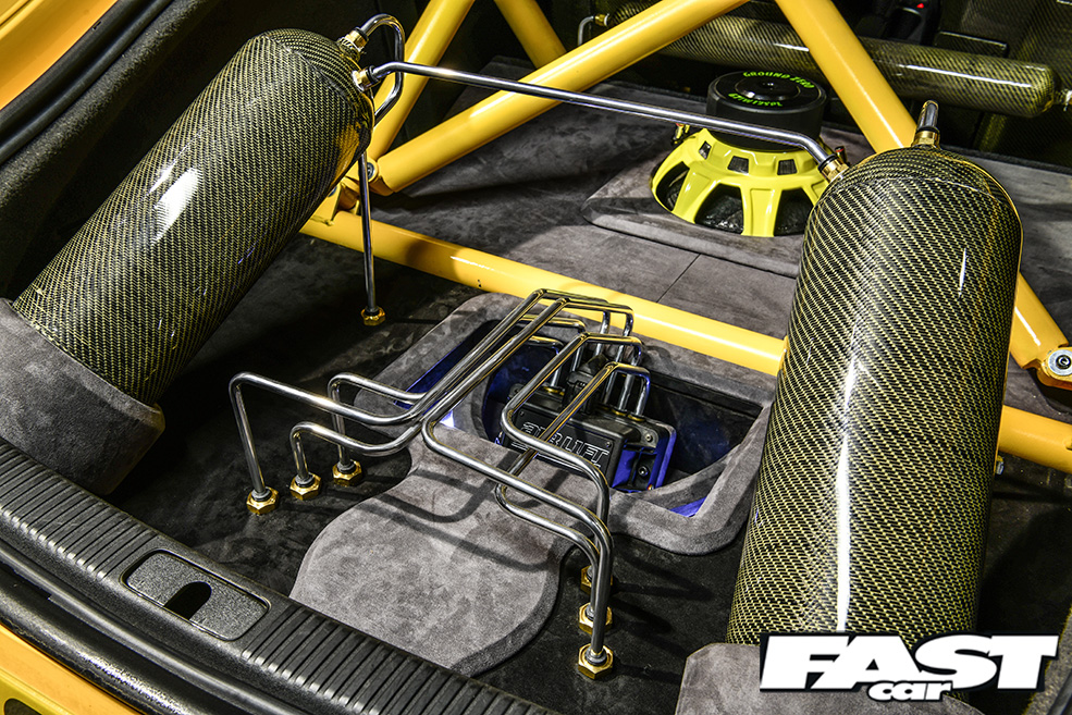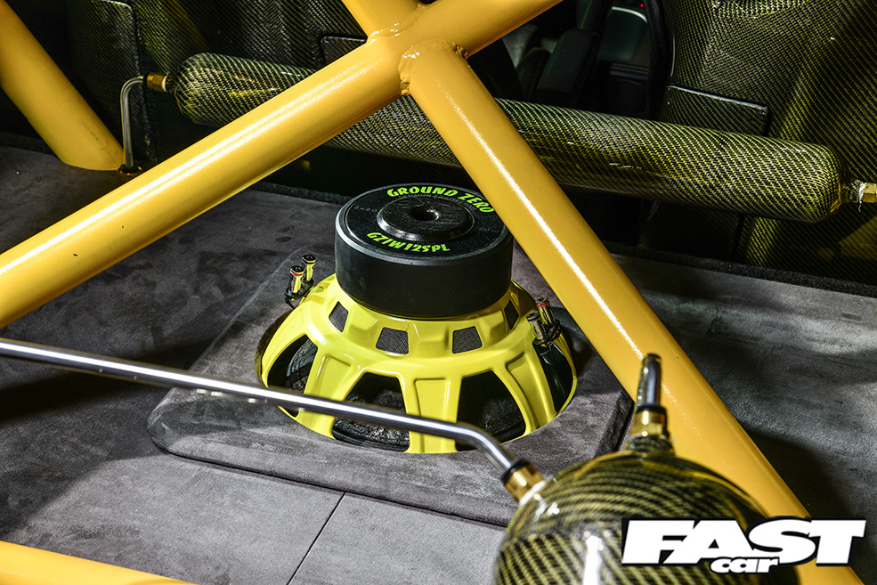 RS4 Recaro F1 seats in carbon fibre and yellow Kevlar, RS steering wheel in carbon fibre and yellow Kevlar, yellow ND Fabrication rollcage, full Alcantara-trimmed hardline air install – Air Lift tanks in carbon fibre and yellow Kevlar, Ground Zero sub and amp