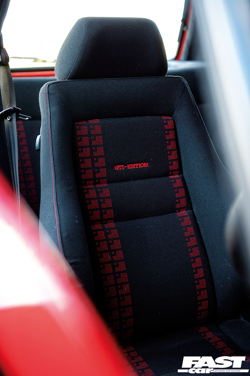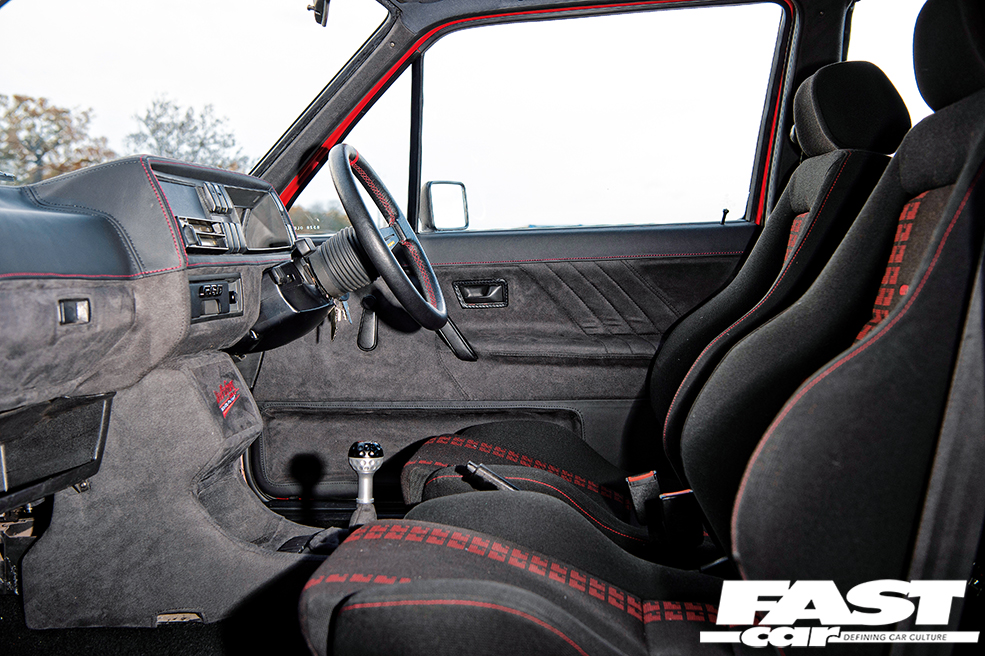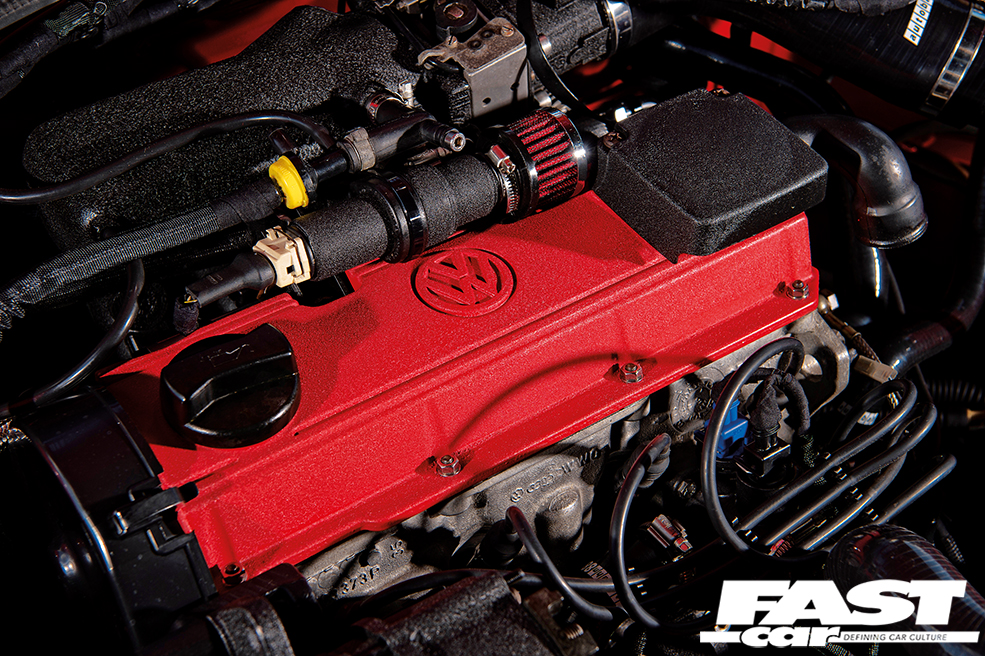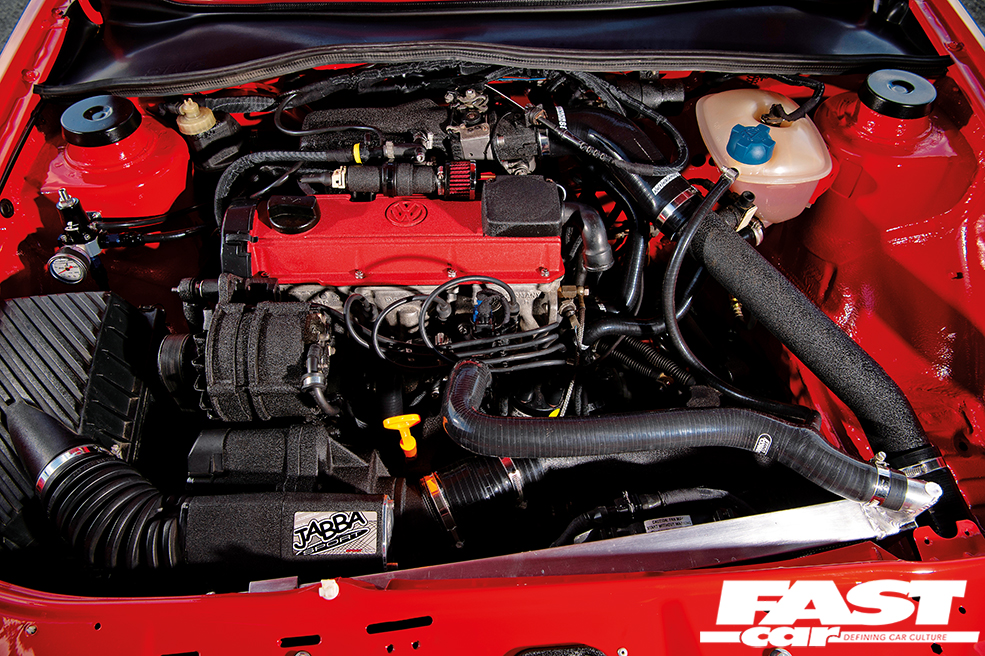 1.8-litre G60 with ceramic coated exhaust manifold, BBM aluminium fuel rail, Speed Flow fuel pipe fittings, Teflon performance fuel lines, Aeromotive adjustable fuel pressure regulator, Mk3 Golf fuel tank and 4bar fuel pump, stainless steel induction pipe, silicon hoses, Jabba Sport Stage 4 supercharger, chip and pulley (200bhp), RSR supercharger outlet, front-mount intercooler, VR6 aluminium radiator, uprated radiator fan, 02A cable change gearbox, VR6 clutch, 9” brake servo upgrade, 22mm master cylinder, hydraulic clutch fitted including pedal box, K&N air filter, Powerflow 2” stainless steel exhaust, battery relocated to boot