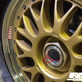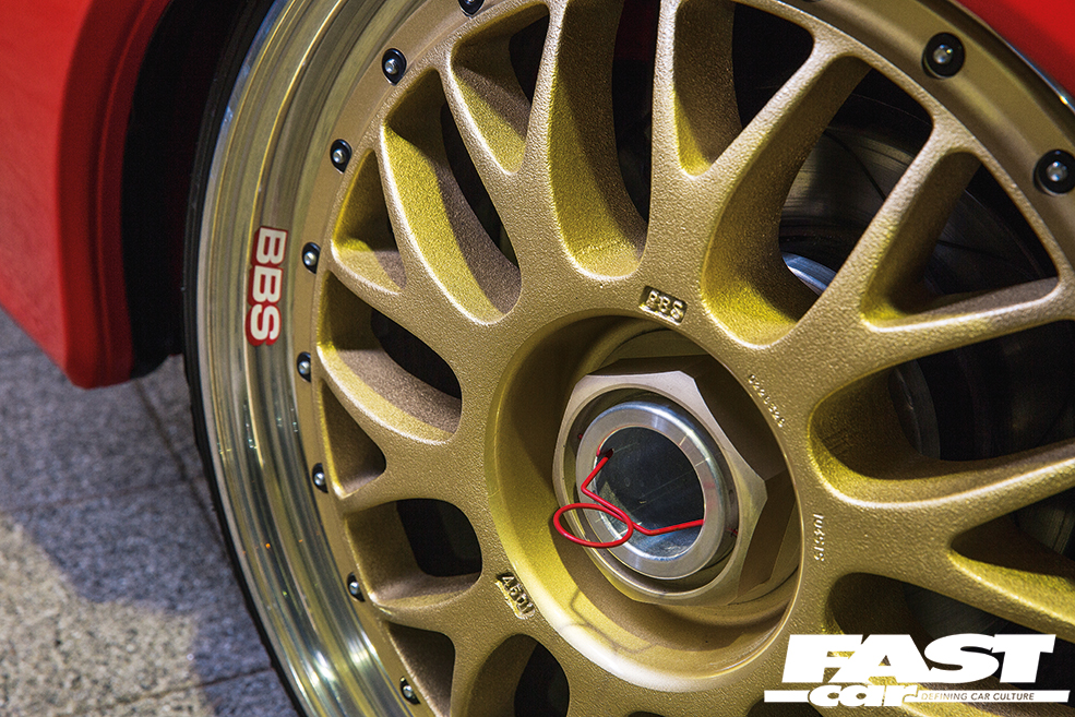 7.5×18 BBS E28 wheels with gold crackle-paint magnesium centres restored and milled by Felgen Renninger, Felgen Renninger centre-lock adaptors, 165/35 Nankang AS-1 tyres, H&R Deep 180mm coilovers by K-Custom