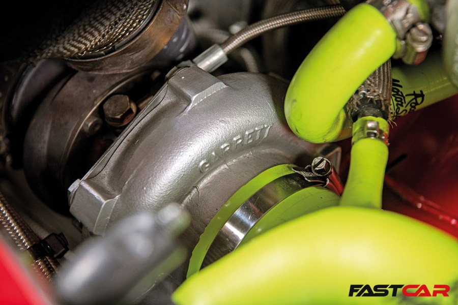 Heat management was very much on his mind too, heat-shielding various areas to prevent soak from the stainless manifold as well as going to the trouble of fitting an AEM water/meth injection system to aid with inlet temps and ignition. The fuelling was necessarily upgraded, with a new tank and 340lph AEM pump joined by AN fittings and PTFE braided lines throughout, and a Forge fuel regulator.