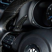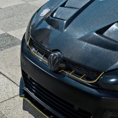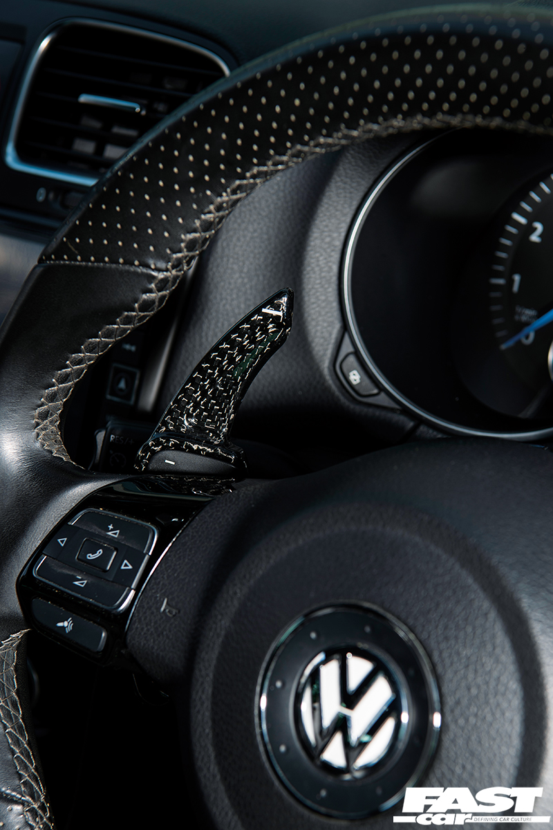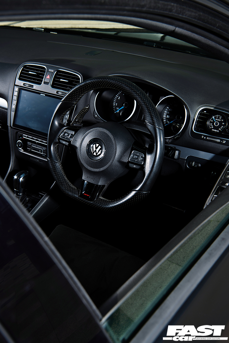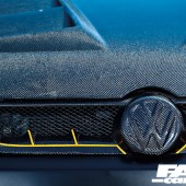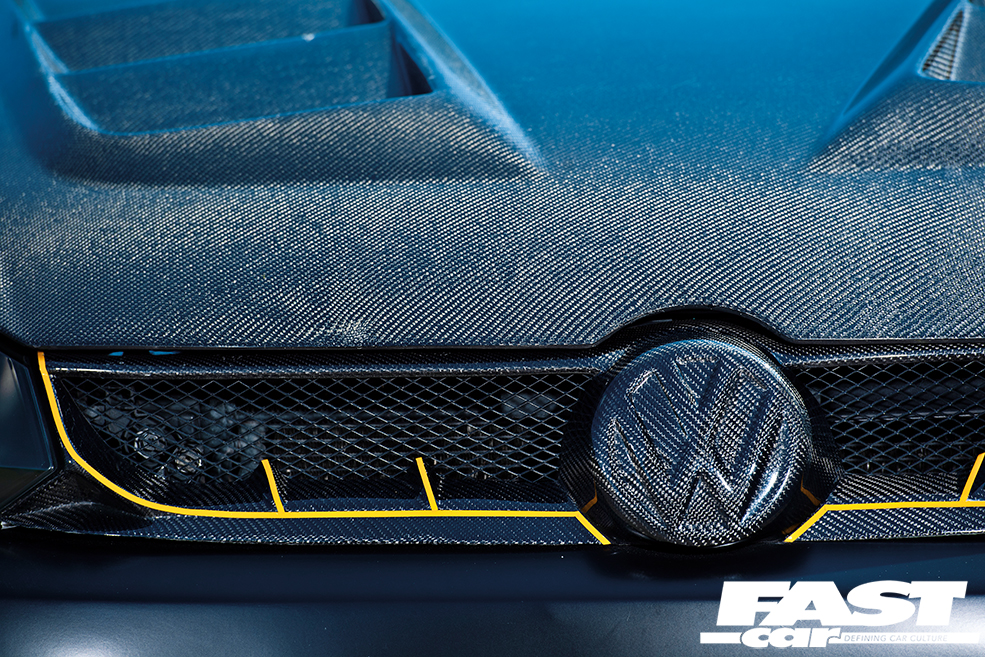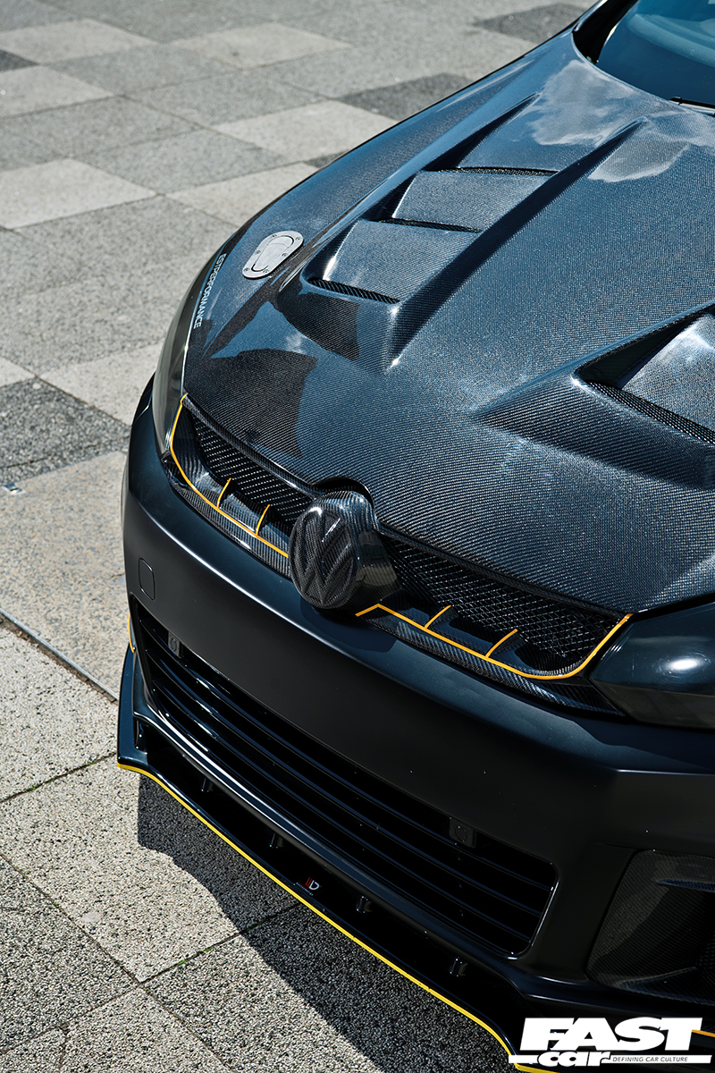 You might have spotted that he’s gone a bit mad with the carbon fibre too. Intriguingly it’s the carbon grille badge that first catches the eye, and the more you look, the more of the racy weave you find sprinkled across the shell. It seems like nearly everything’s made of the stuff, from the front wings to the custom vented bonnet, the foglight covers and front grille, canards, sideskirts, and of course the imposing rear spoiler from Rex Supersport. Sitting pretty over its 19” OZ Ultraleggera HLTs, the Golf really makes a statement with its yellow pinstripes and details picked out against the light-absorbing satin black wrap.