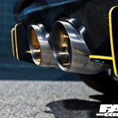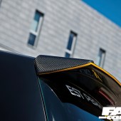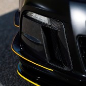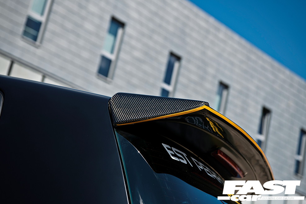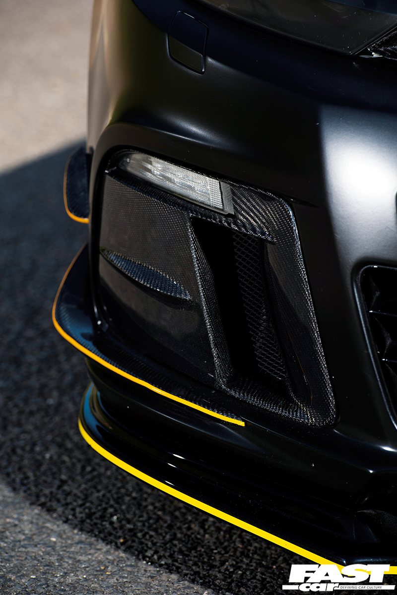Carbon fibre wings, carbon foglight covers, carbon front grille, carbon canards, carbon bonnet, carbon sideskirts, carbon rear spoiler by Rex Supersport, Maxton Design front splitter, Maxton Design rear diffuser, satin black wrap with reflective yellow pinstriping by Monsterwraps
