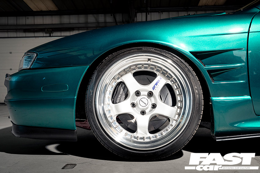 10×18” ET4 (front) and 12×18” ET-8 (rear) WORK Meister S1 wheels, 225/40 (f) and 265/35 (r) Falken FK510 tyres, custom centre caps