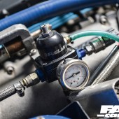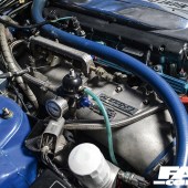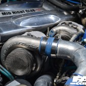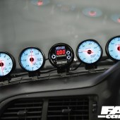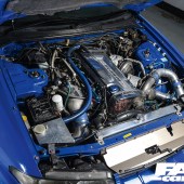 Inside, there’s an array of 60mm Apexi gauges located on top of the dash, along with the Turbosmart boost controller and AEM wide band display. Otherwise, the interior has been left surprisingly standard, considering the hardcore nature of the mechanicals underneath. A similar plan of attack can be found on the outside, as the rare Le Mans blue color was a limited edition, so exterior styling has been left relatively standard. The larger 18-inch Rota wheels are the only addition, fitted to aid brake clearance and allow a wider tire to help improve grip, which is the job of the 265/35×18 Federal RSR semi-slick tires.