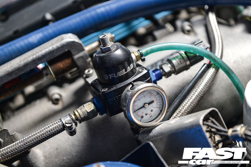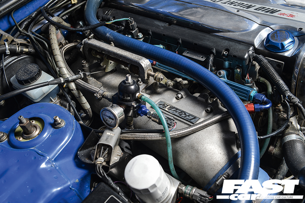 Providing the boost is a rare set up, as most big power Skyline tuners tend to convert to a single, large turbo. Here, the twin set up remains, but the turbos are much larger: T67-25G items from GReddy. They are mounted on modified GReddy top mount manifolds, so are nice and prominent with the bonnet open. The turbos are regulated with a pair of huge HKS 50mm external wastegates, complete with individual screamer pipes. The boost is sent via custom pipework to a huge HKS 150mm ‘drag spec’ intercooler mounted up front, before being sent on to a GReddy inlet plenum to feed the head. The fueling side of things it taken care of by a GReddy 11mm fuel rail that supply huge 1000cc HKS ‘drag spec’, top fed injectors. A pair of Tomei 270-litre fuel pumps, located inside the fuel tank, keep these happy whilst everything is controlled by an HKS F-Con ECU and a Turbosmart E boost 2 controller.