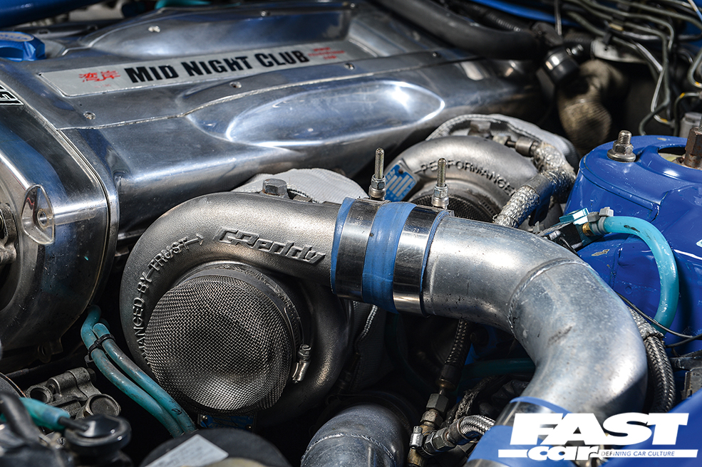 At the heart of the build is a hugely modified RB26, based upon a stronger N1 block. Internally, it features an HKS Step III conversion, complete with a 77.7mm billet steel crankshaft, which is reportedly good for 1500bhp or so. The oversized HKS step design pistons and rods offer a larger capacity and, to keep it lubricated, there’s a JUN high-flow oil pump along with a Trust high capacity baffled sump. The cylinder head is an extensively modified item too. Rebuilt by Abbey Motorsport and fitted with 272-degree, 10.1mm lift camshafts of unknown origin, along with adjustable Tomei pulleys. It’s sealed to the block using an HKS 2.0mm steel head gasket and a matching HKS ‘drag spec’ head bolt set. So, yes, it’s quite involved.