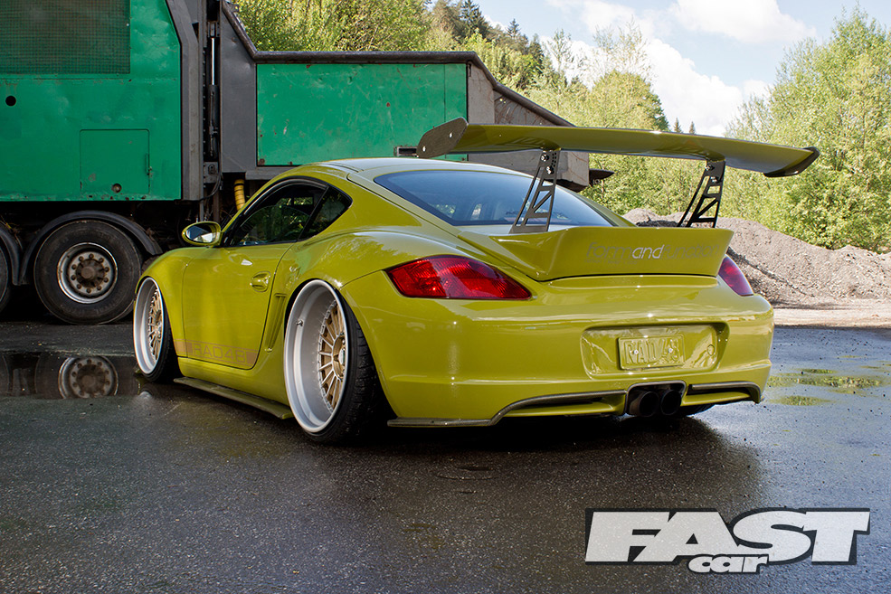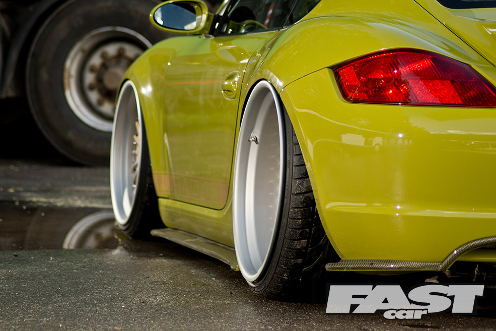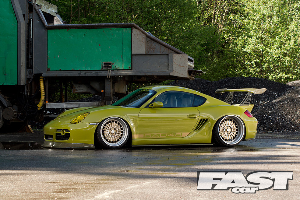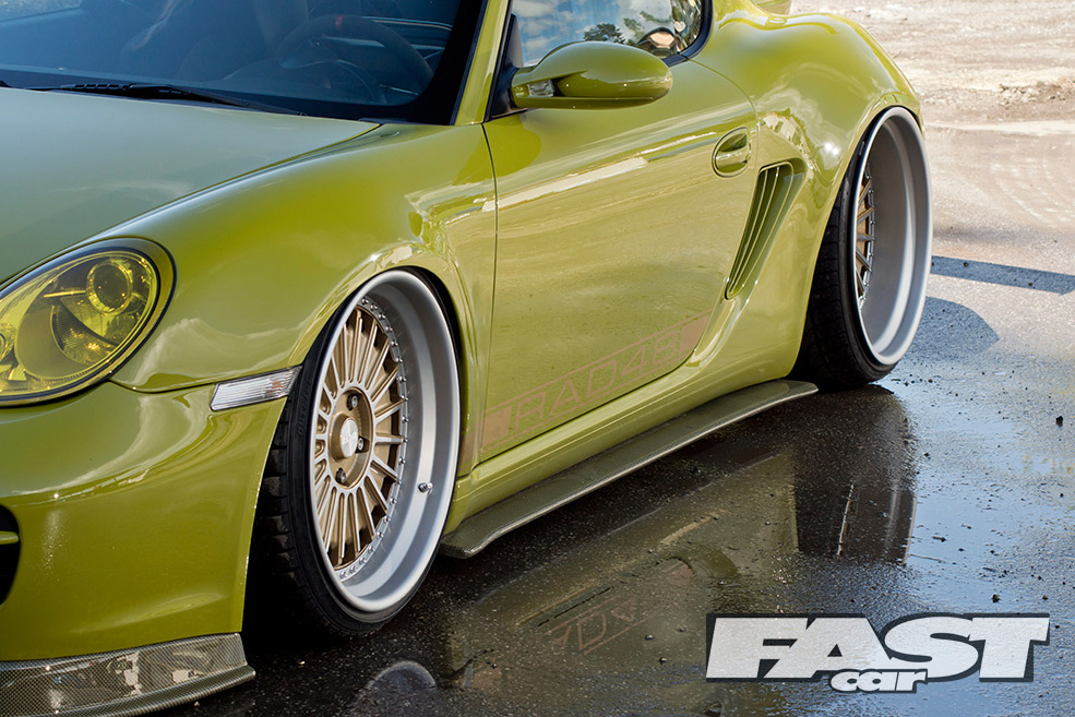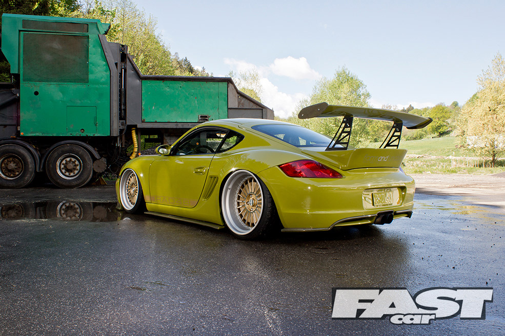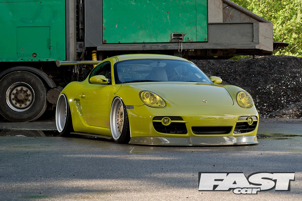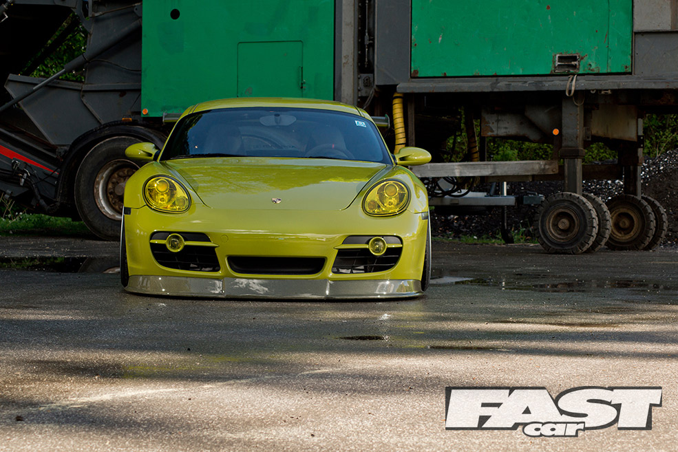 That downright antagonistic colour is only half the story though, with the air suspension and those crazy wheels both combining to create a Cayman that will leave Porsche purists scurrying for the nearest bunker.