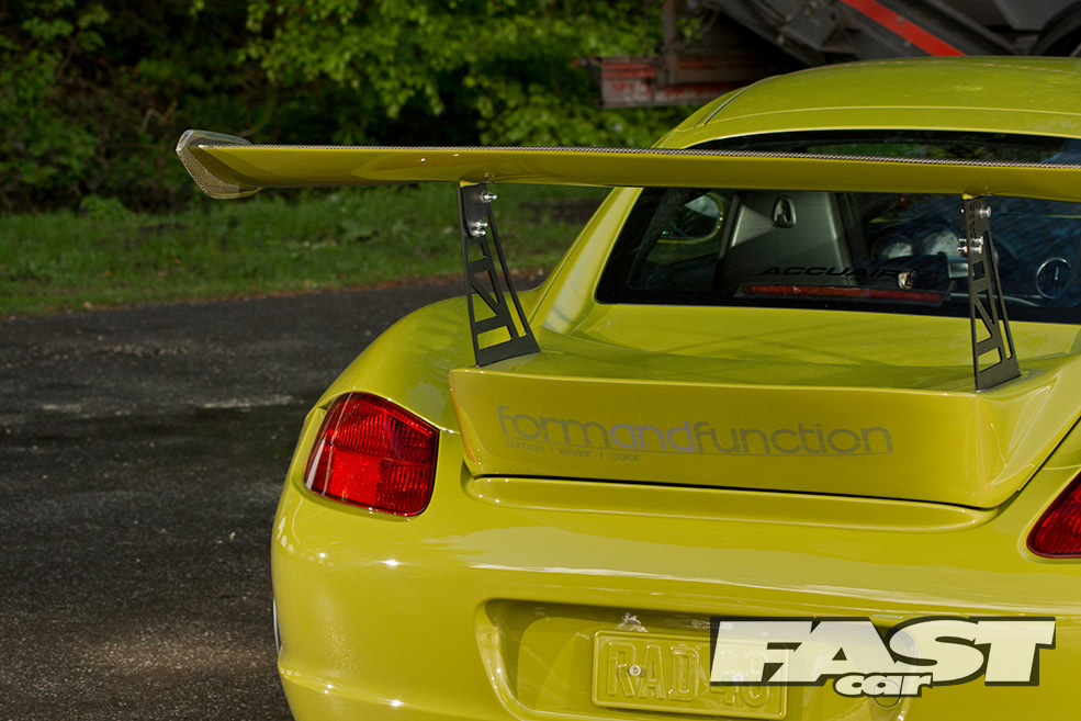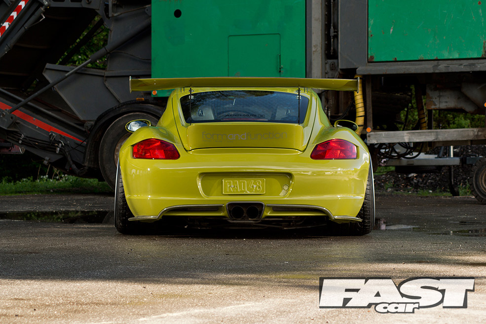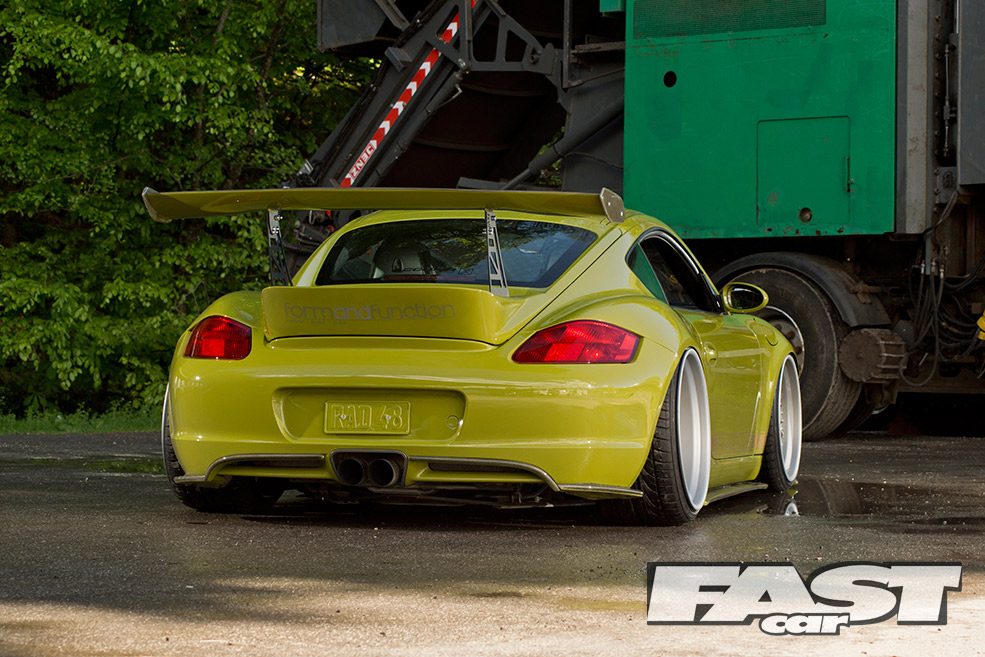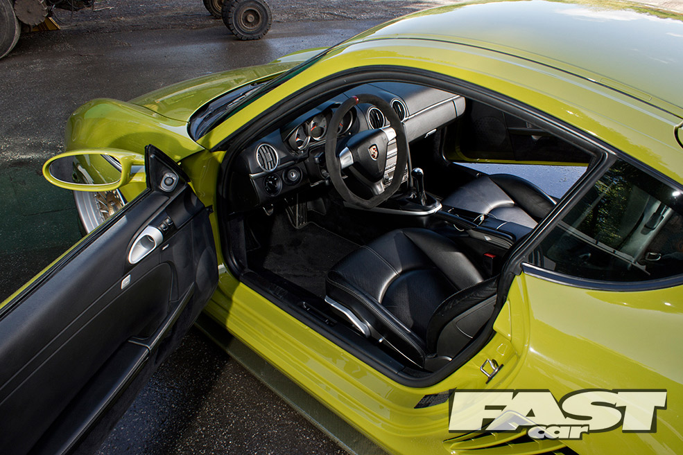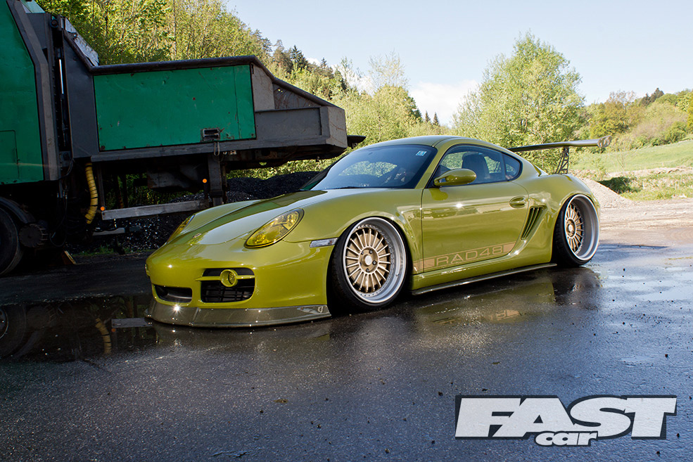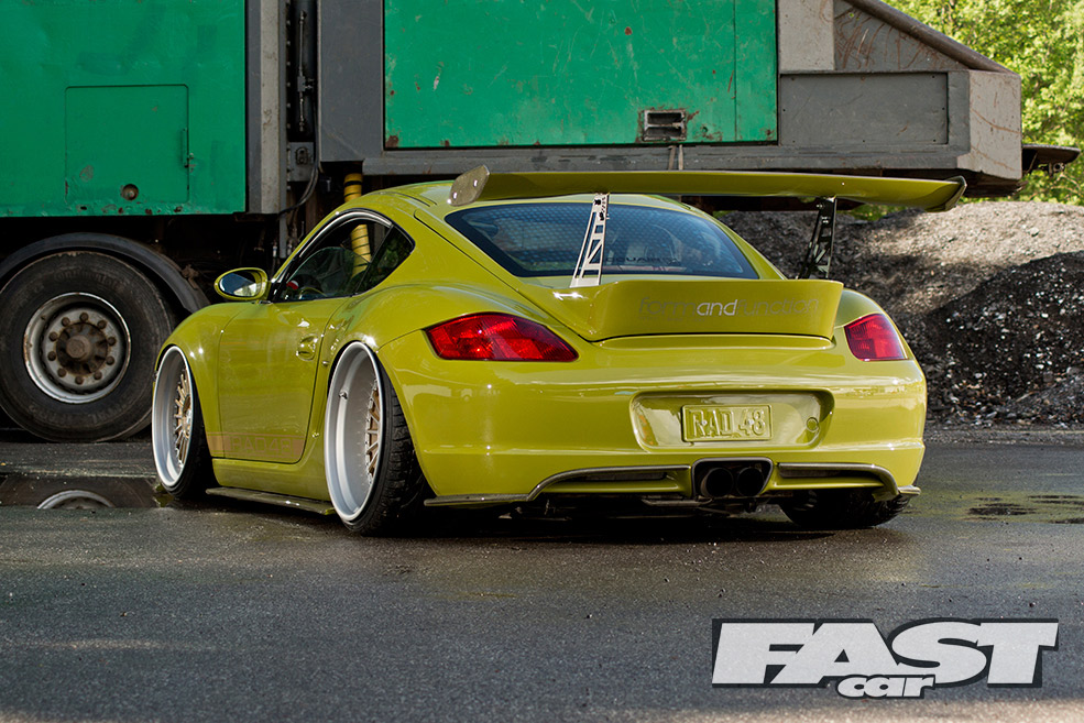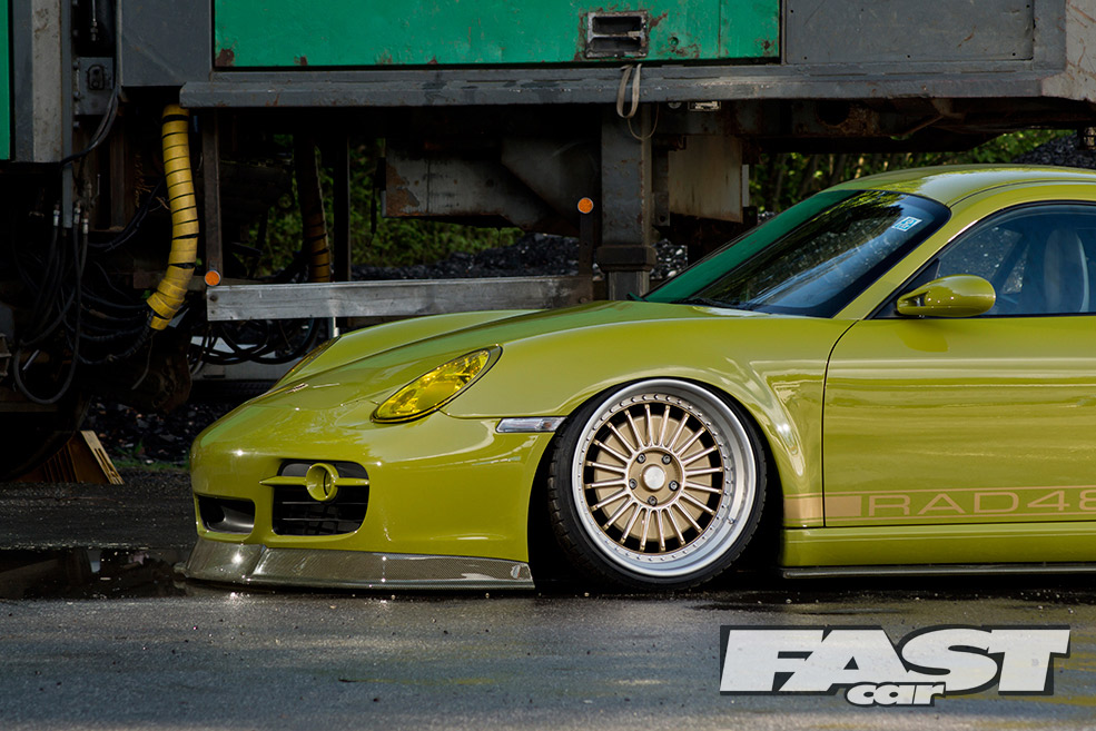 That downright antagonistic colour is only half the story though, with the air suspension and those crazy wheels both combining to create a Cayman that will leave Porsche purists scurrying for the nearest bunker.