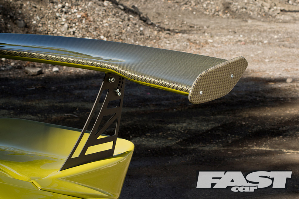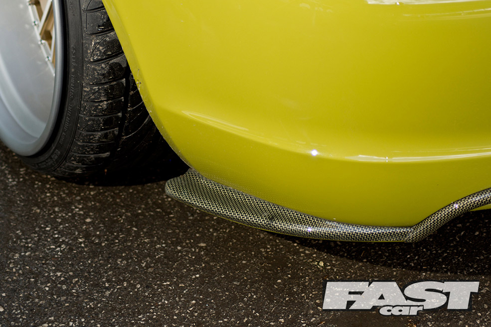 Custom ‘mud honey yellow’ respray, wide body kit with flared arches front and rear, custom carbon fibre front splitter, rear diffuser and rear wings, yellow tinted headlights.