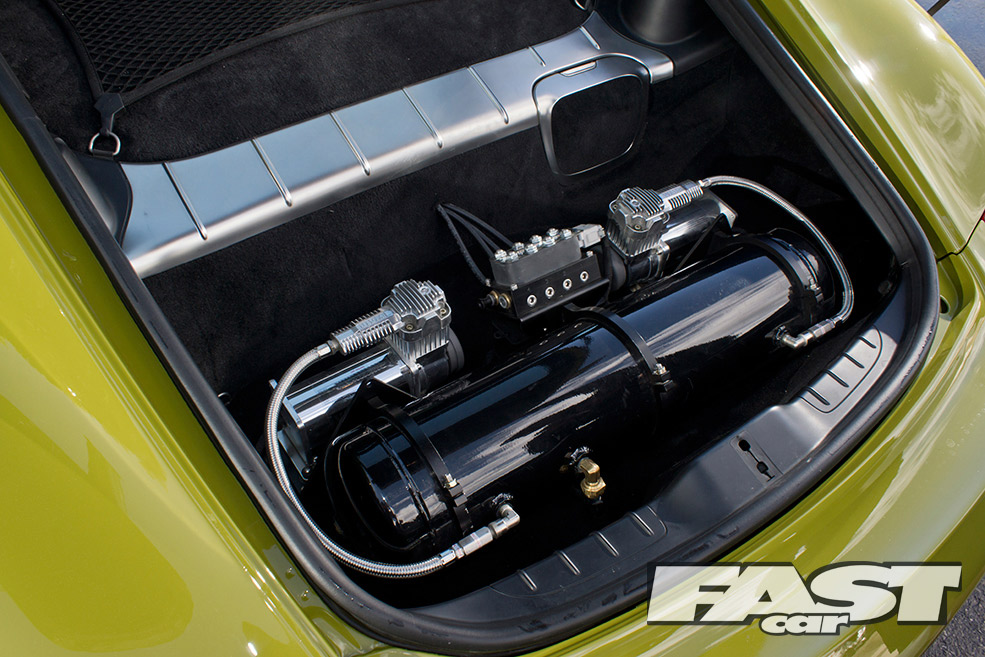 The air setup has been handled by AccuAir, a firm with a wealth of hard won experience and a name that’s graced the pages of this very publication a fair few times over the last year or so. We’ve grown accustomed to seeing all manner of air suspension setups over the years and it’s also fair to say that it’s easy to become a little blasé about them, but the way Mario and his friends have packaged the AccuAir setup in their Cayman is a breath of fresh air. Yes it’s a bit of a cliché and something of an overused phrase, but lift the lid and you really could be forgiven for assuming that Porsche put it their themselves – high praise indeed!