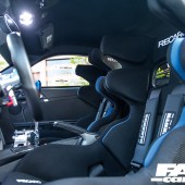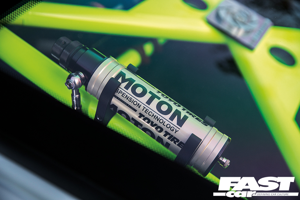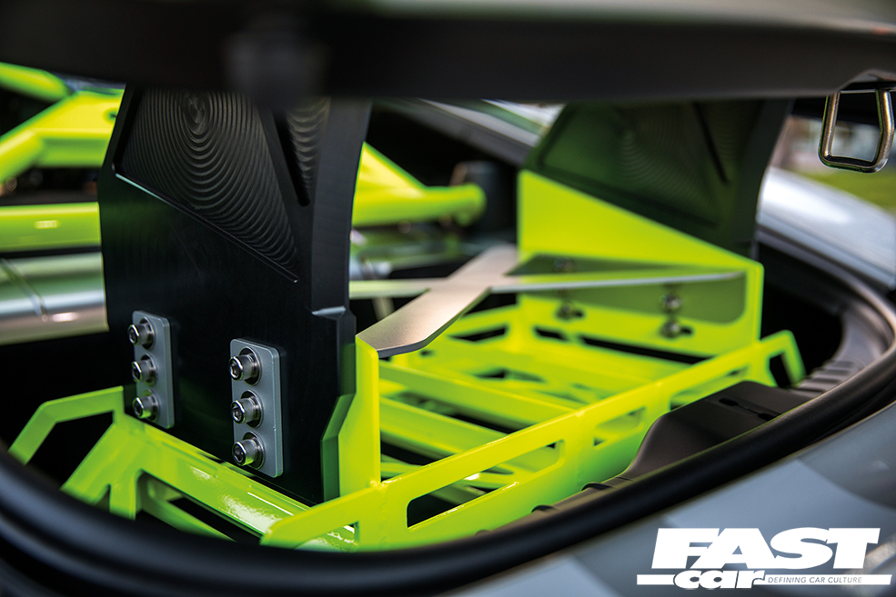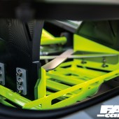 Open up the driver’s door and you are greeted with yet more track-approved goodies, most notably the Acid Green GMG rollcage and the Recaro P1300 GT carbon seats. “The seats are also genuine GT3 items and cost a cool $24,000 for the pair!” reveals Dionne. “They were easily the single most expensive items on the car, but for me a build is all in the details, so they’re well worth it.”