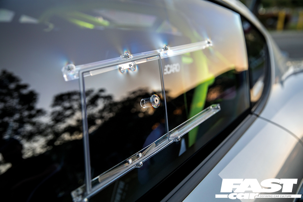 Complementing the seats is a set of Schroth Profi III six-point harnesses, a Momo steering wheel, Plastics4Performance Perspex windows and a burnt titanium gearknob mounted high on a trick CAE short shifter. This slick cog-swapper not only looks the dog’s danglies, but allows much faster, more precise changes of ratio to keep the naturally aspirated flat-six singing.