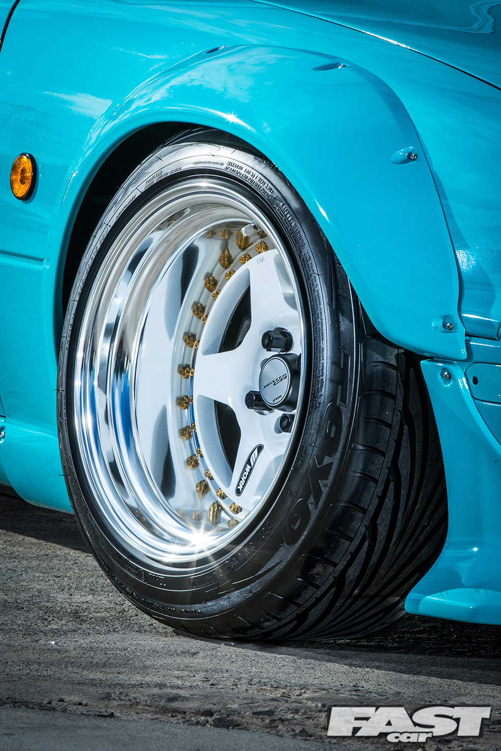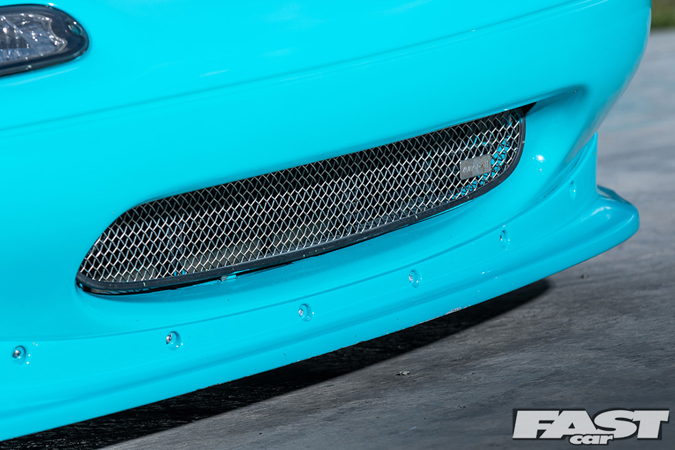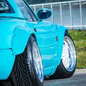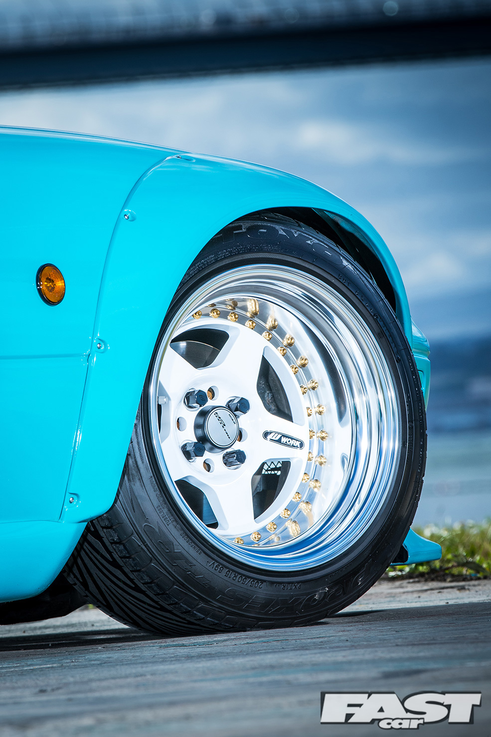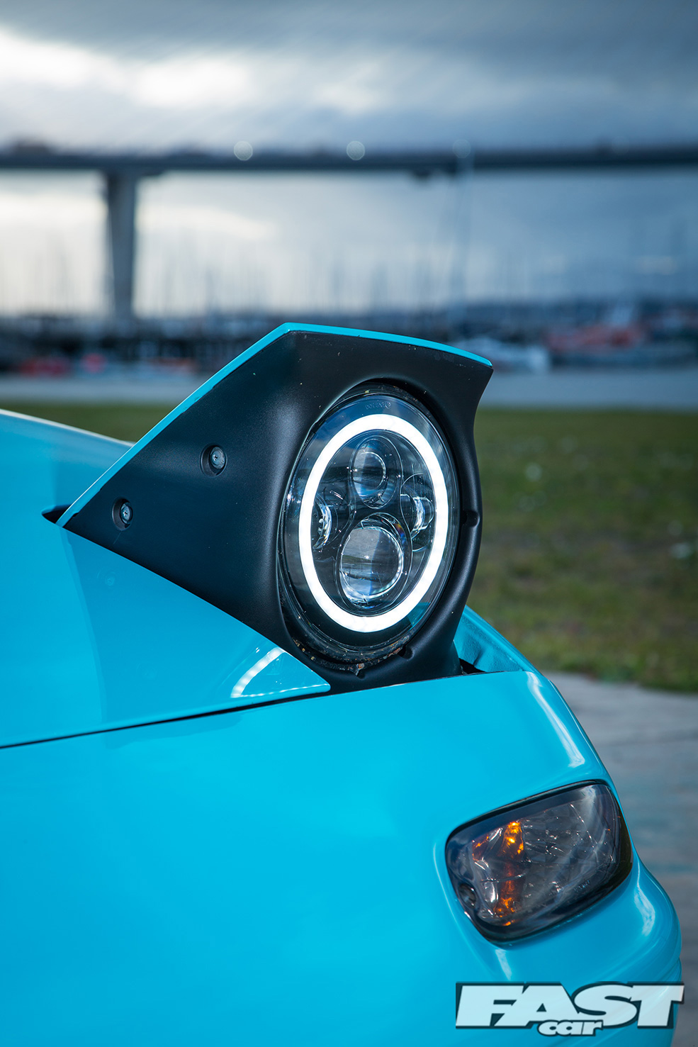 Sensible girl. In preparation of the custom wheel order, HSD Monopro coilovers were fitted and the car was dropped off for the body prep. New wings were added along with the kit, LED headlights, smoked side-lights and a Eunos rear panel. Front bumper smoothing and de-chroming completed the mix before the turquoise was chosen.