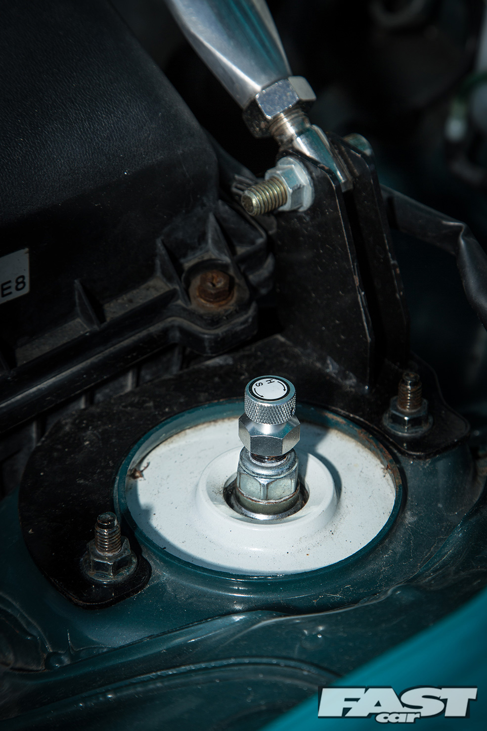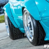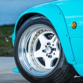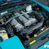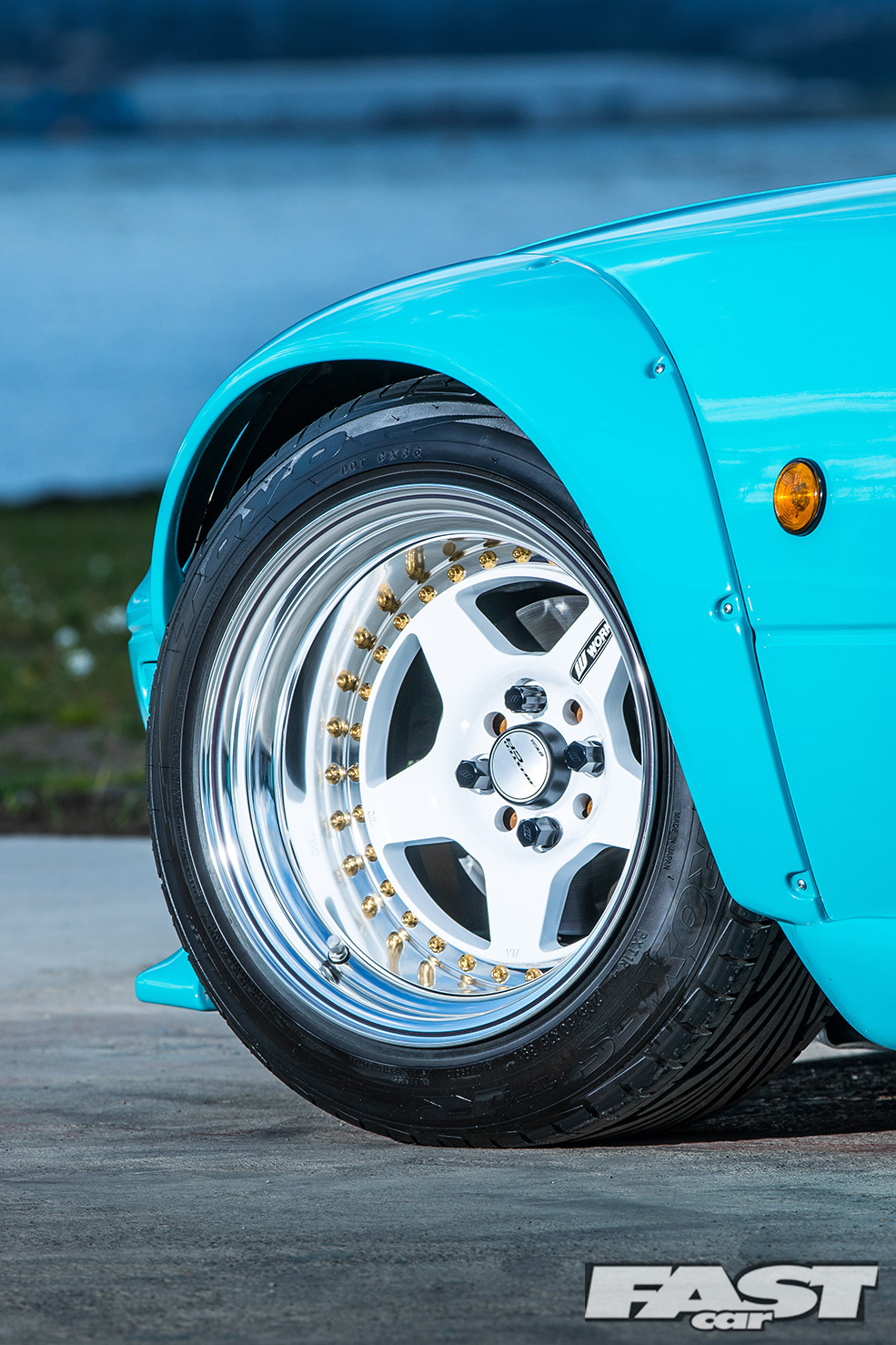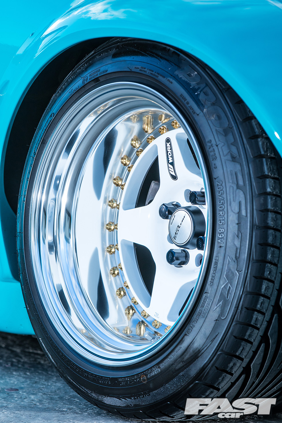 Sensible girl. In preparation of the custom wheel order, HSD Monopro coilovers were fitted and the car was dropped off for the body prep. New wings were added along with the kit, LED headlights, smoked side-lights and a Eunos rear panel. Front bumper smoothing and de-chroming completed the mix before the turquoise was chosen.